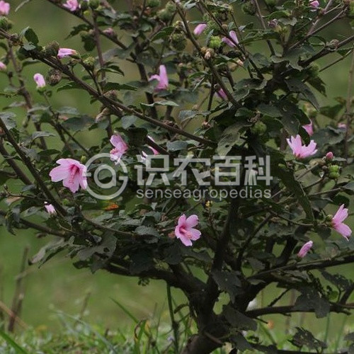 小灌木,高80厘米,枝平鋪,小枝被星狀絨毛。葉下部生的輪廓為掌狀3-5深裂,裂口深達中部以下,圓形而狹,長1.5-6厘米,寬1-4厘米,裂片菱形或倒卵形,呈葫蘆狀,先端鈍,基部圓形至近心形,具鋸齒,兩面均被星狀短硬毛,葉柄長4-15毫米,被絨毛;托葉鉆形,長約1.5毫米,早落。花單生或近簇生,花梗長2-3毫米;小苞片長約7毫米,基部1/3處合生,疏被星狀毛;萼短于小苞片或近等長,卵形,尖頭,被星狀毛;花冠淡紅色,花瓣長10-15毫米;雄蕊柱無毛,與花瓣等長。果球形,直徑約6毫米,具刺和長硬毛,刺端有倒鉤,種子平滑無毛。花期6-9月。