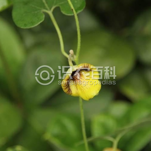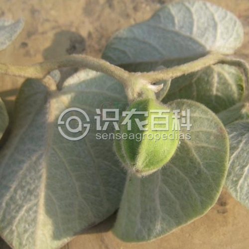 木質(zhì)藤本;根細(xì)長,圓柱形;嫩枝密被灰白色長綿毛,老枝無毛,干后常有縱槽紋,暗褐色。葉紙質(zhì),卵形、卵狀心形,長3.5-10厘米,寬2.5-8厘米,頂端鈍圓至短尖,基部心形,基部兩側(cè)裂片廣展,灣缺深1-2厘米,邊全緣,上面被糙伏毛,下面密被灰色或白色長綿毛,基出脈5-7條,側(cè)脈每邊3-4條;葉柄長2-5厘米,密被白色長綿毛。花單生于葉腋,花梗長1.5-3厘米,直立或近頂端向下彎,中部或中部以下有小苞片;小苞片卵形或長卵形,長5-15毫米,寬3-10毫米,無柄,頂端短尖,兩面被毛與葉相同;花被管中部急遽彎曲,下部長1-1.5厘米,直徑3-6毫米,彎曲處至檐部較下部短而狹,外面密生白色長綿毛,內(nèi)面無毛;檐部盤狀,圓形,直徑2-2.5厘米,內(nèi)面無毛或稍被微柔毛,淺黃色,并有紫色網(wǎng)紋,外面密生白色長綿毛,邊緣淺3裂,裂片平展,闊三角形,近等大,頂端短尖或鈍;喉部近圓形,直徑2-3毫米,稍呈領(lǐng)狀突起,紫色;花藥長圓形,成對(duì)貼生于合蕊柱近基部,并與其裂片對(duì)生;子房圓柱形,長約8毫米,密被白色長綿毛;合蕊柱頂端3裂;裂 片頂端鈍圓,邊緣向下延伸,并具乳實(shí)狀突起。蒴果長圓狀或橢圓狀倒卵形,長3-5米,直徑1.5-2厘米,具6條呈波狀或扭曲的稜或翅,暗褐色,密被細(xì)綿毛或毛常脫落而變無毛,成熟時(shí)自頂端向下6瓣開裂;種子卵狀三角形,長約4毫米,寬約3毫米,背面平凸?fàn)睿甙櫦y和隆起的邊緣,腹面凹入,中間具膜質(zhì)種脊。花期4-6月,果期8-10月。