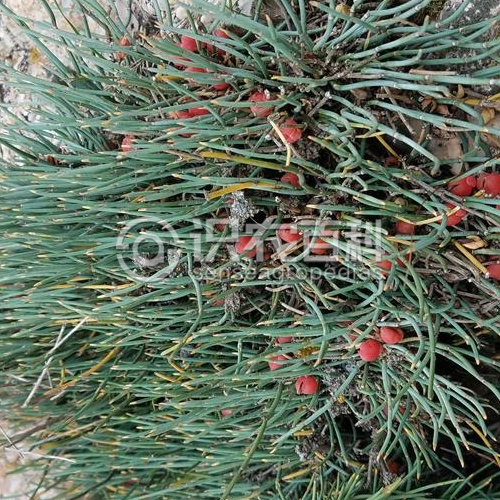 草本狀灌木,高20-40厘米;木質莖短或成匍匐狀,小枝直伸或微曲,表面細縱槽紋常不明顯,節間長2.5-5.5厘米,多為3-4厘米,徑約2毫米。葉2裂,鞘占全長1/3-2/3,裂片銳三角形,先端急尖。雄球花多成復穗狀,常具總梗,苞片通常4對,雄蕊7-8,花絲合生,稀先端稍分離;雌球花單生,在幼枝上頂生,在老枝上腋生,常在成熟過程中基部有梗抽出,使雌球花呈側枝頂生狀,卵圓形或矩圓狀卵圓形,苞片4對,下部3對合生部分占1/4-1/3,最上一對合生部分達1/2以上;雌花2,胚珠的珠被管長l毫米或稍長,直立或先端微彎,管口隙裂窄長,約占全長的1/4-1/2,裂口邊緣不整齊,常被少數毛茸。雌球花成熟時肉質紅色,矩圓狀卵圓形或近于圓球形,長約8毫米,徑6-7毫米;種子通常2粒,包于苞片內,不露出或與苞片等長,黑紅色或、灰褐色,三角狀卵圓形或寬卵圓形,長5-6毫米,徑2.5-3.5毫米,表面具細皺紋,種臍明顯,半圓形。花期5-6月,種子8-9月成熟。