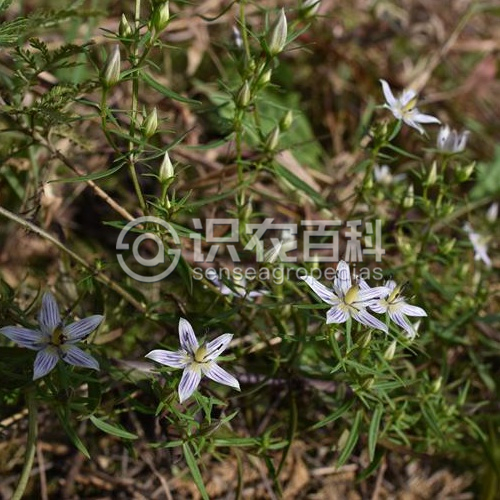 一年生草本,高20-70厘米。根黃色。莖直立,四棱形,棱上具窄翅,基部直徑2-4毫米,多分枝,枝細(xì)瘦,斜升。葉無柄,線狀披針形至線形,長(zhǎng)10-45毫米,寬1.5-9毫米,兩端漸狹,下面中脈明顯突起。圓錐狀復(fù)聚傘花序具多數(shù)花;花梗直立,四棱形,長(zhǎng)至1.5厘米;花5數(shù),直徑1-1.5厘米;花萼綠色,長(zhǎng)于或等于花冠,裂片線形,長(zhǎng)6-12毫米,先端銳尖,背面中脈明顯;花冠淺藍(lán)色,裂片橢圓狀披針形,長(zhǎng)6-11毫米,先端急尖,基部有2個(gè)腺窩,腺窩窄矩圓形,溝狀,周緣具長(zhǎng)柔毛狀流蘇;花絲線形,長(zhǎng)達(dá)6毫米,花藥狹矩圓形,長(zhǎng)約1.6毫米;子房無柄,橢圓狀卵形至卵狀披針形,花柱粗短,柱頭2裂,裂片半圓形。蒴果卵形,長(zhǎng)至1.2厘米;種子深褐色,矩圓形,長(zhǎng)0.6-0.8毫米,表面具小瘤狀突起。染色體2n=18,20,24。花果期8-10月。