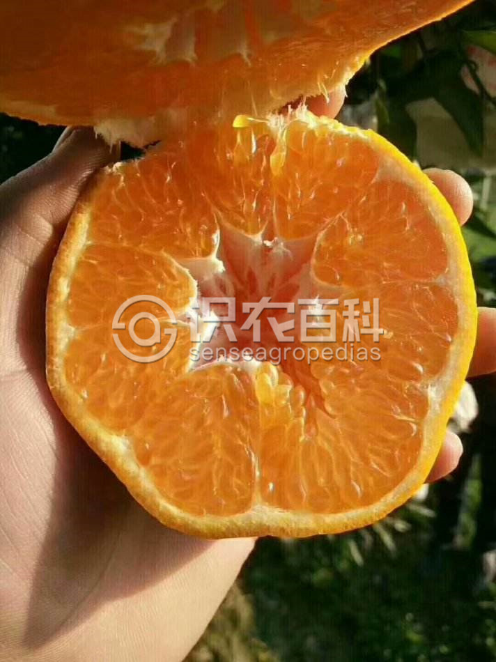 樹姿較直立,結果后下垂。生長勢旺,枝梢抽發量大,樹冠形成快,果實呈高扁圓形或倒闊卵形;平均單果重200g,最大果重350g;果皮橙紅色,皮脆、薄,皮厚0.26cm,剝皮較易,果面光滑,具光澤,油胞細密,果肩放射狀溝明顯,果頂內凹;果肉深橙色,囊瓣8~9瓣,易分離,肉質脆嫩多汁極化渣,風味蜜甜、濃郁。