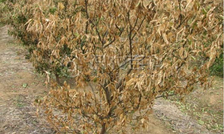 (4)凍害后補(bǔ)救及時(shí)淋水或灌水,及時(shí)進(jìn)行一次中耕松土。葉片凋萎而枝梢不干枯的,可在氣溫回暖穩(wěn)定后的春初摘除干葉;枝條已干枯的,應(yīng)抓緊剪除,傷口和存留的枝條均要涂白保護(hù),同時(shí),及時(shí)施用春季萌芽肥和防治病害,尤其流膠病、炭疽病。新芽抽出后,適期噴施葉面肥,適當(dāng)控制花果量。