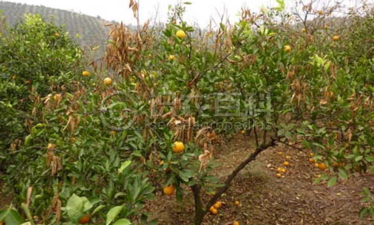 葉片局部出現(xiàn)形狀、大小不一的葉肉塌陷斑,初為灰青色,后轉(zhuǎn)淺褐色至灰白色,后期極易感染炭疽病;嚴(yán)重者,整片葉片凋萎,縱卷,赤褐色,多數(shù)脫落;枝梢變黃,部分落葉的葉痕褐色,流膠,最后枝梢枯死。嚴(yán)重凍害,枝干和大枝條裂皮或枯死,以至于樹干皮層腐爛,地上部死亡,幼樹全株枯死。果實(shí)受凍,一般在樹冠上部和外圍明顯,果實(shí)囊瓣枯水收縮,與果皮脫離,汁胞干癟,粒化,汁少渣多,味淡;嚴(yán)重時(shí),囊瓣如同開水燙熟,汁液外滲,隨后變味,果實(shí)腐爛。