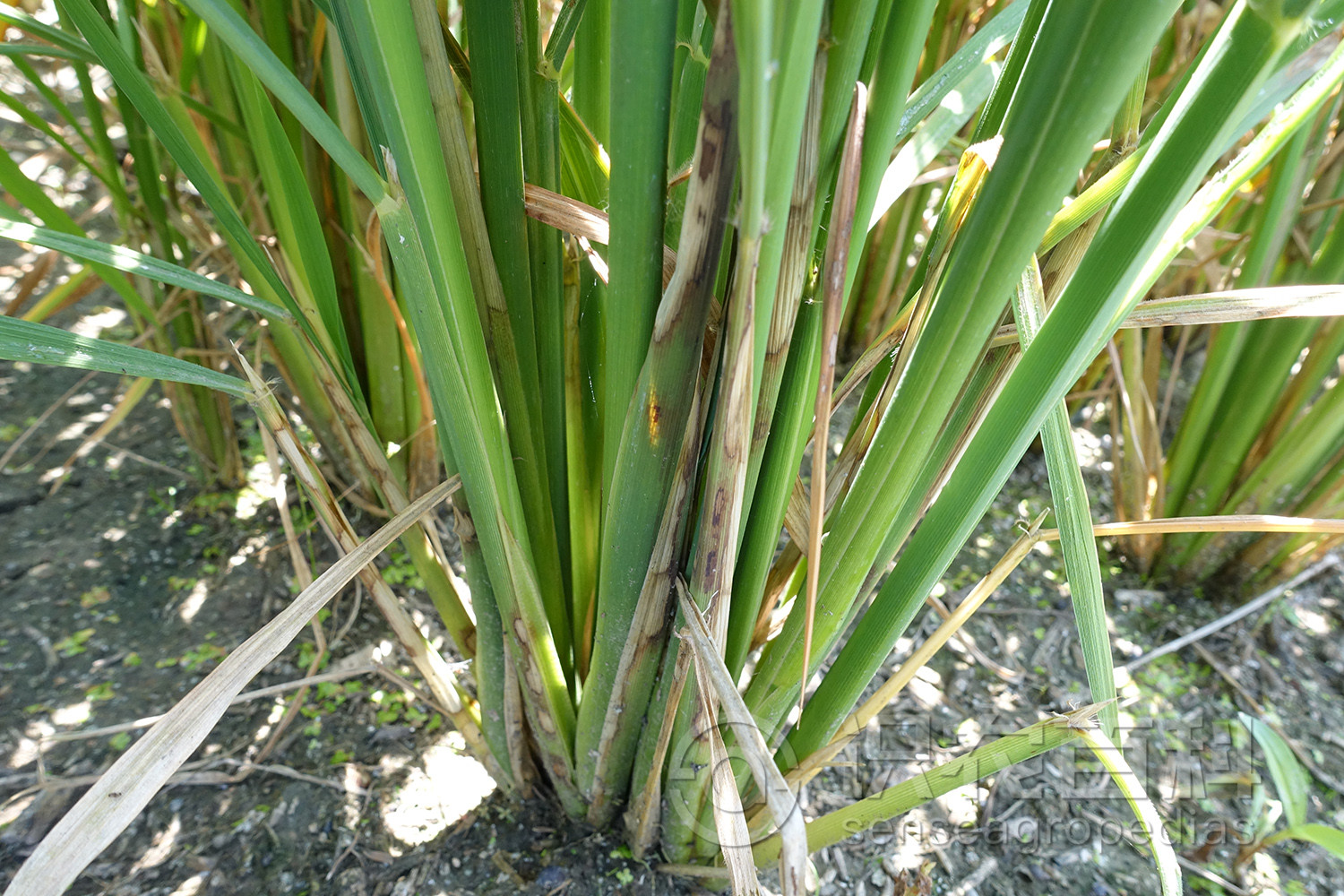 (1)葉鞘:葉鞘近水面處產生暗綠色水漬狀小斑點,后期擴大呈橢圓形,似云紋狀,常多個病斑融合成。大斑紋。條件適宜時,病斑邊緣暗綠色,中央灰綠色,擴展迅速。天氣干燥時,病斑邊緣褐色,中央草黃色至灰白色。可導致植株倒伏或整株枯死。