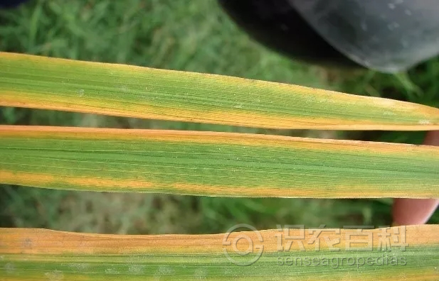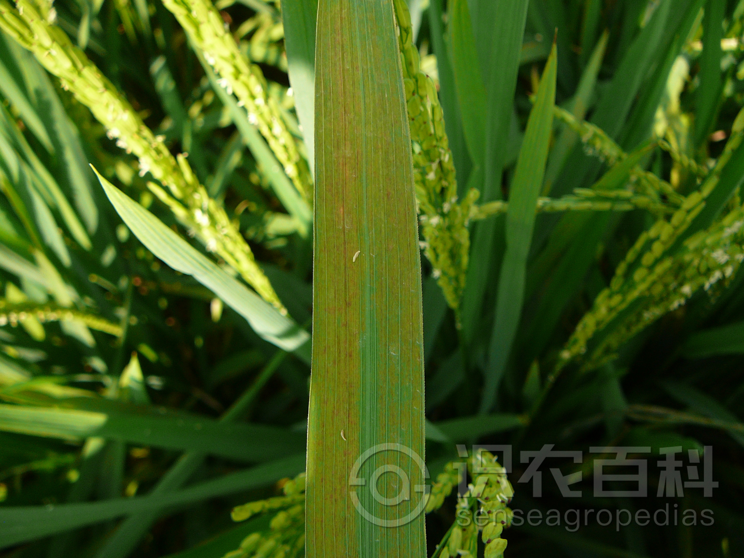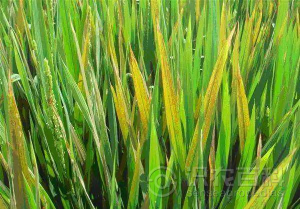 從下位葉開始出現赤褐色焦尖和斑點,并逐步向上位葉擴展,嚴重時田間水稻葉面發紅似火燎狀。株高降低,葉色灰暗,抽穗不齊,成穗率低,穗小,結實率差,籽粒不飽滿。