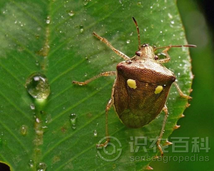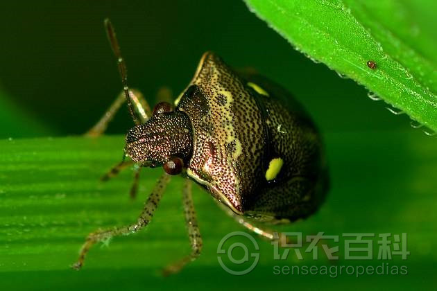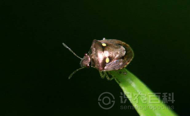 成蟲頭部全黑色。觸角淺黃褐色,具5節。前胸背板側角短,背板的服區黑斑前緣可達前胸背板的前緣,小盾片末端多無明顯的錨形淺色斑,在小盾片基角具2個黃白光滑的小圓斑。胸部腹面污白色,密布黑色點刻,腹部腹面黑色,節間明顯,氣門黑褐色。足淡褐色,密布黑色小點刻。