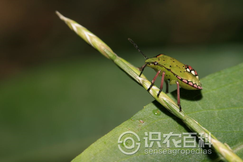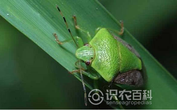 成蟲體橢圓形,體、足全鮮綠色,頭近三角形,觸角第3節末及4、5節端半部黑色,其余青綠色。前胸背板的角鈍圓,前側緣多具黃色狹邊。小盾片長三角形,末端狹圓,基緣有3個小白點,兩側角外各有1個小黑點。腹面色淡,腹部背板全綠色。
