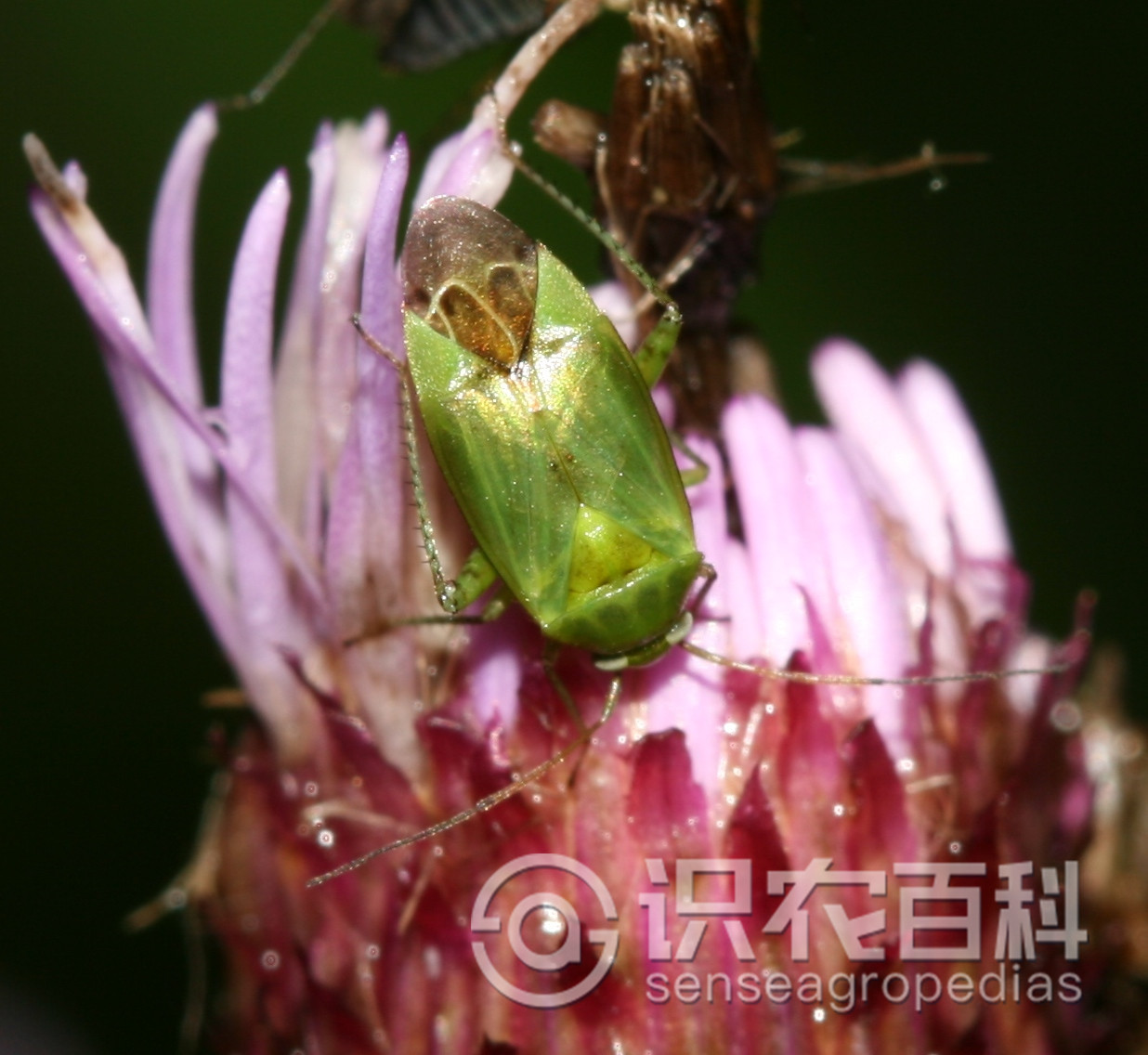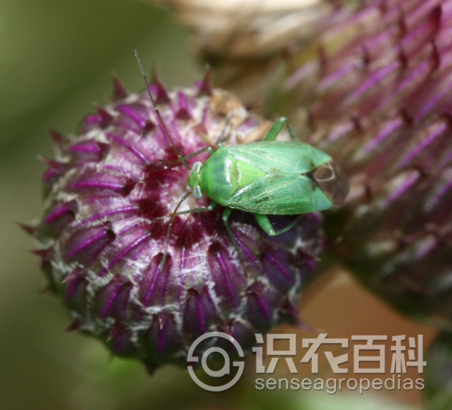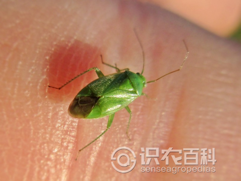 成蟲體長5mm,寬2.2mm,綠色,密被短毛。頭部三角形,黃綠色,復眼黑色突出,無單眼,觸角4節絲狀,較短,約為體長2/3,第2節長等于3、4節之和,向端部顏色漸深,1節黃綠色,4節黑褐色。