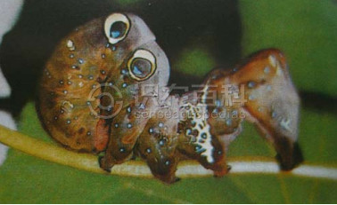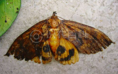 成蟲體長35-42毫米,翅展98-100毫米;頭、胸部棕褐色,腹部背面橙黃色,觸角絲狀,灰黑色;前翅枯葉褐色,雌蛾體色較深;前翅頂角很尖,外緣呈弧形向內極度彎斜,后緣中部內凹,弧度寬;翅脈清晰,上有許多小黑點排列;環紋為一黑點,腎紋黃綠色;后翅橘黃色,亞端區有一牛角狀黑帶,中后部有一腎形黑斑紋。卵乳白色,近球形,底平,卵殼表面有六角形網紋。幼蟲老熟時體長60-70毫米,頭部紅褐色,體色多變,有黃褐色或灰褐色。背線、亞背線、氣門線、及腹線均為暗褐色。第二、三腹節兩側各有一眼形斑,中間黑色;第六腹節亞背線和亞腹線有一方形白斑,上有許多黃褐色圈和斑點。蛹紅褐色或灰褐色,長30-32毫米,臀棘4對,外有黃白色絲將葉片黏連在一起包裹蛹體。