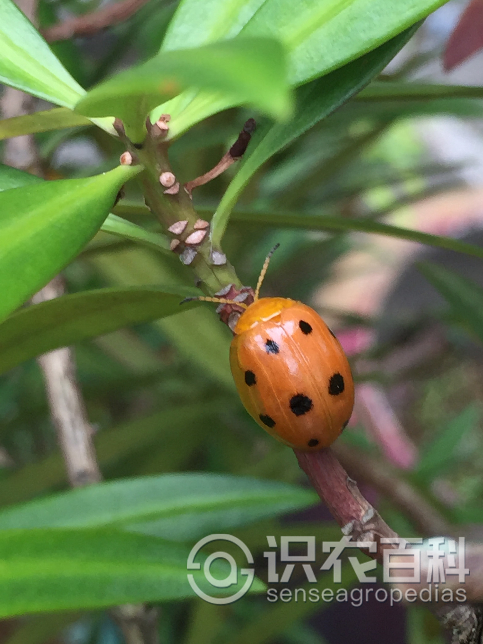 十星瓢螢葉甲又名葡萄十星葉甲。屬鞘翅目,葉甲科。體長12~13mm,頭部甚小,大部縮入前胸內。觸角絲狀,淡黃色,末端3節及第四節端部黑褐色。前胸背板上密布細刻點。兩鞘翅上共有黑色圓斑10個。卯橢圓形,長約1mm初為黃綠色,后漸變為暗褐色表面有很多不規則的小突起。幼蟲末齡幼蟲體長12~15血m,體扁而肥,近長橢圓形。頭部小,黃褐色。胸、腹部淡黃至土黃色。除前胸和尾節外,各節背板均有兩橫列黑斑,中后胸每列各4個,腹部前列4個后列6個。除尾節外,各節兩側均具肉質突起3個,突起頂端黑褐色。