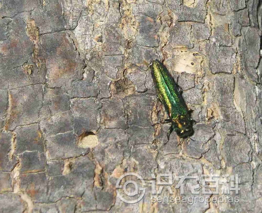 吉丁蟲俗稱爆皮蟲、銹皮蟲,屬鞘翅目、吉丁科。成蟲咬食葉片造成缺刻,幼蟲蛀食枝干皮層,被害處有流膠,為害嚴重時樹皮爆裂,故名“爆皮蟲”,甚至造成整株枯死。