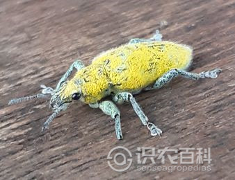 成蟲體長(zhǎng)15~18mm,體黑色,表面密被閃光的粉綠色鱗毛,少數(shù)灰色至灰黃色,表面常附有橙黃色粉末而呈黃綠色,有些個(gè)體密被灰色或褐色鱗片。頭管背面扁平,具縱溝5條。觸角短粗。復(fù)眼明顯突出。前胸寬大于長(zhǎng),背面具寬而深的中溝及不規(guī)則刻痕。鞘翅上各具10行刻點(diǎn)。雌蟲胸部盾板茸毛少,較光滑,鞘翅肩角寬于胸部背板后緣,腹部較大;雄蟲胸部盾板茸毛多,鞘翅肩角與胸部盾板后緣等寬,腹部較小。