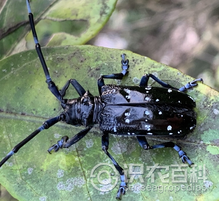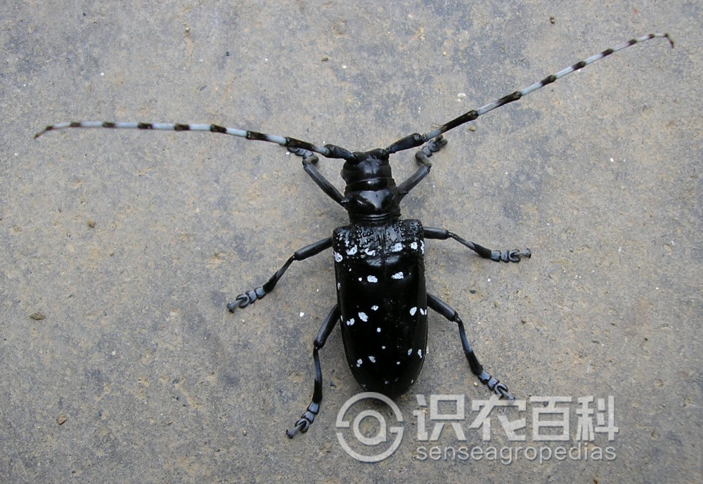 (1)成蟲。體長約24~39mm,寬9~15mm,體漆黑色,有光澤。觸角鞭狀11節(jié),觸角第3節(jié)至末端各節(jié)基部均有青白色細(xì)茸毛組成的小斑紋,雄蟲觸角超出體外4~5節(jié),雌蟲觸角超出體外1~2節(jié)。頭部中央有縱走凹線。前胸背板中部有3個(gè)瘤狀突起,兩側(cè)各有1個(gè)粗短的刺突。翅鞘黑色,每鞘翅上面散布大小不一由細(xì)毛組成的白色斑點(diǎn)約20個(gè)。鞘翅基部密布大小不一的顆粒。