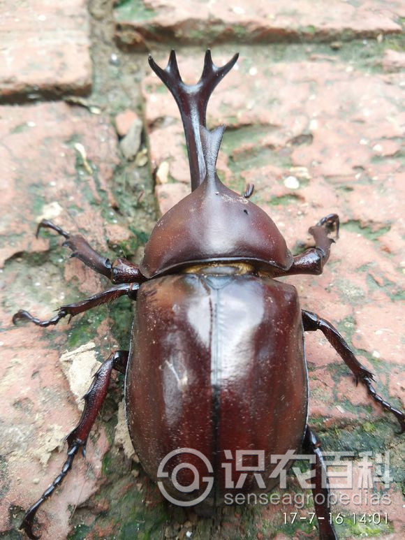 犀金龜屬于鞘翅目,頭部和前胸背板大多有明顯突出的分叉角,形似犀牛角,故得名。:犀金龜科亦稱獨(dú)角仙科,是一特征鮮明的類群,依其上顎多少外露而于背面可見(jiàn),上唇為唇基覆蓋;觸角10節(jié),鰓片部3節(jié)組成;前胸腹板于基節(jié)之間生出柱形、三角形、舌形等垂突等特征而易于識(shí)別。多大型至特大型種類,性二態(tài)現(xiàn)象在許多屬中顯著,其雄蟲(chóng)頭面、前胸背板有強(qiáng)大角突或其它突起或凹坑,雌蟲(chóng)則簡(jiǎn)單或可見(jiàn)低矮突起。