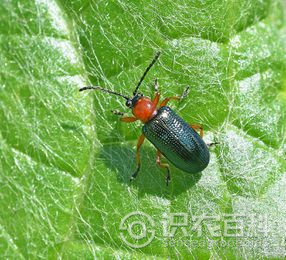 成蟲頭小黑色,復眼也為黑色,前胸背板黃褐色至紅褐色,略呈鐘罩形。鞘翅青藍色,有金屬光澤,一鞘翅上有10條縱橫刻點。足黃色至黃褐色,跗節黑色,體腹面黑色。雌蟲腹面突起,雄蟲較為平坦。卵圓形。幼蟲頭小黑色,頭腹部黃綠到乳白色,體短肥。蛹鮮褐色,外有灰白色棉絮狀的繭。