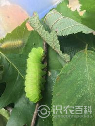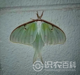 (1)成蟲:體長32-38mm,體豆綠色,密布白色鱗毛。翅粉綠色,前翅前緣紫褐色,前后翅中央各有一橢圓形斑紋,外側(cè)有1條黃褐色波紋,后翅尾狀,特長。