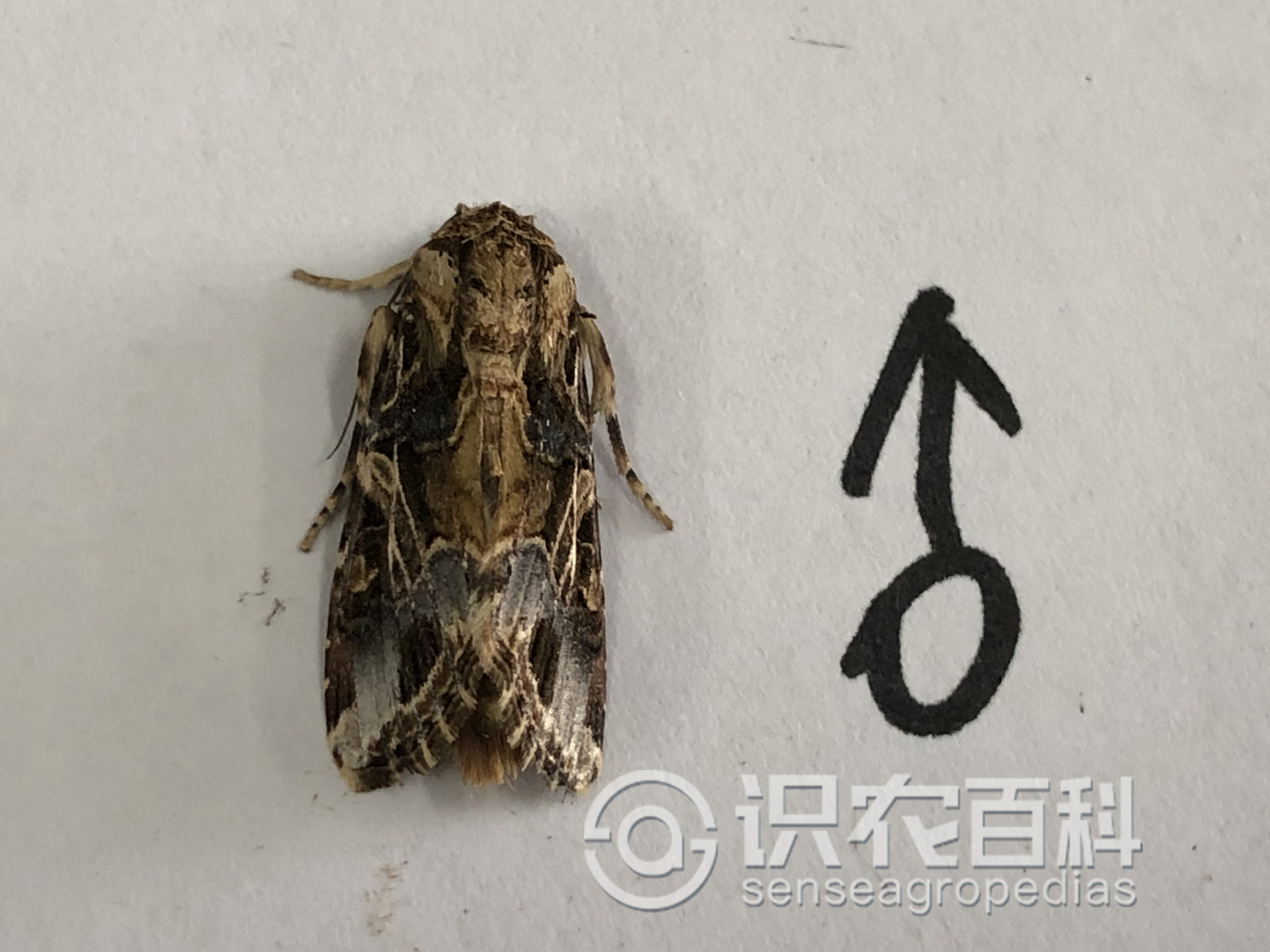 成蟲前翅灰褐色,內橫線和外橫線灰白色,呈波浪形,有白色條紋,環狀紋不明顯,腎狀紋前部呈白色,后部呈黑色,環狀紋和腎狀紋之間有3條白線組成明顯的較寬的斜紋,自翅基部向外緣還有1條白紋。后翅白色,外緣暗褐色。卵半球形,直徑約0.5毫米;初產時黃白色,孵化前呈紫黑色,表面有縱橫脊紋,數十至上百粒集成卵塊,外覆黃白色鱗毛。老熟幼蟲體長38~51毫米,夏秋蟲口密度大時體瘦,黑褐或暗褐色;冬春數量少時體肥,淡黃綠或淡灰綠色。蛹長18~20毫米,長卵形,紅褐至黑褐色。腹末具發達的臀棘一對。幼蟲體色變化很大,主要有3種:淡綠色、黑褐色、土黃色。