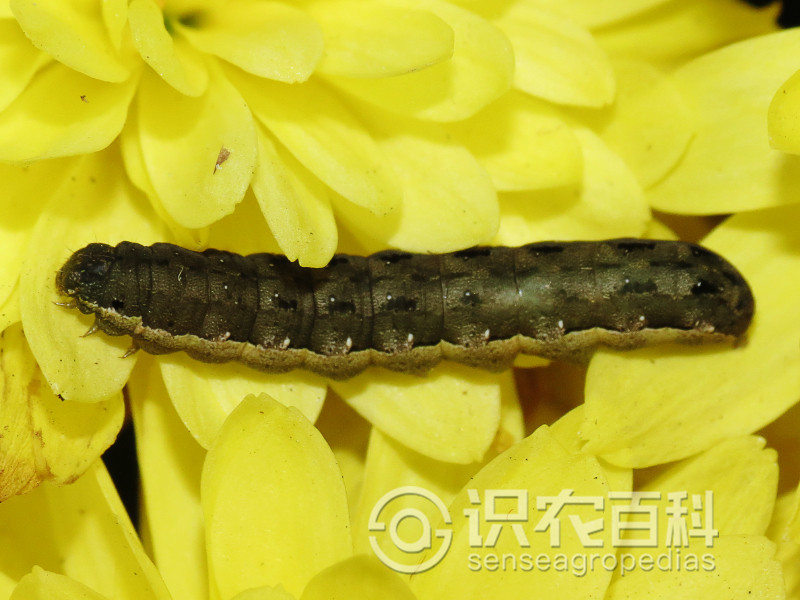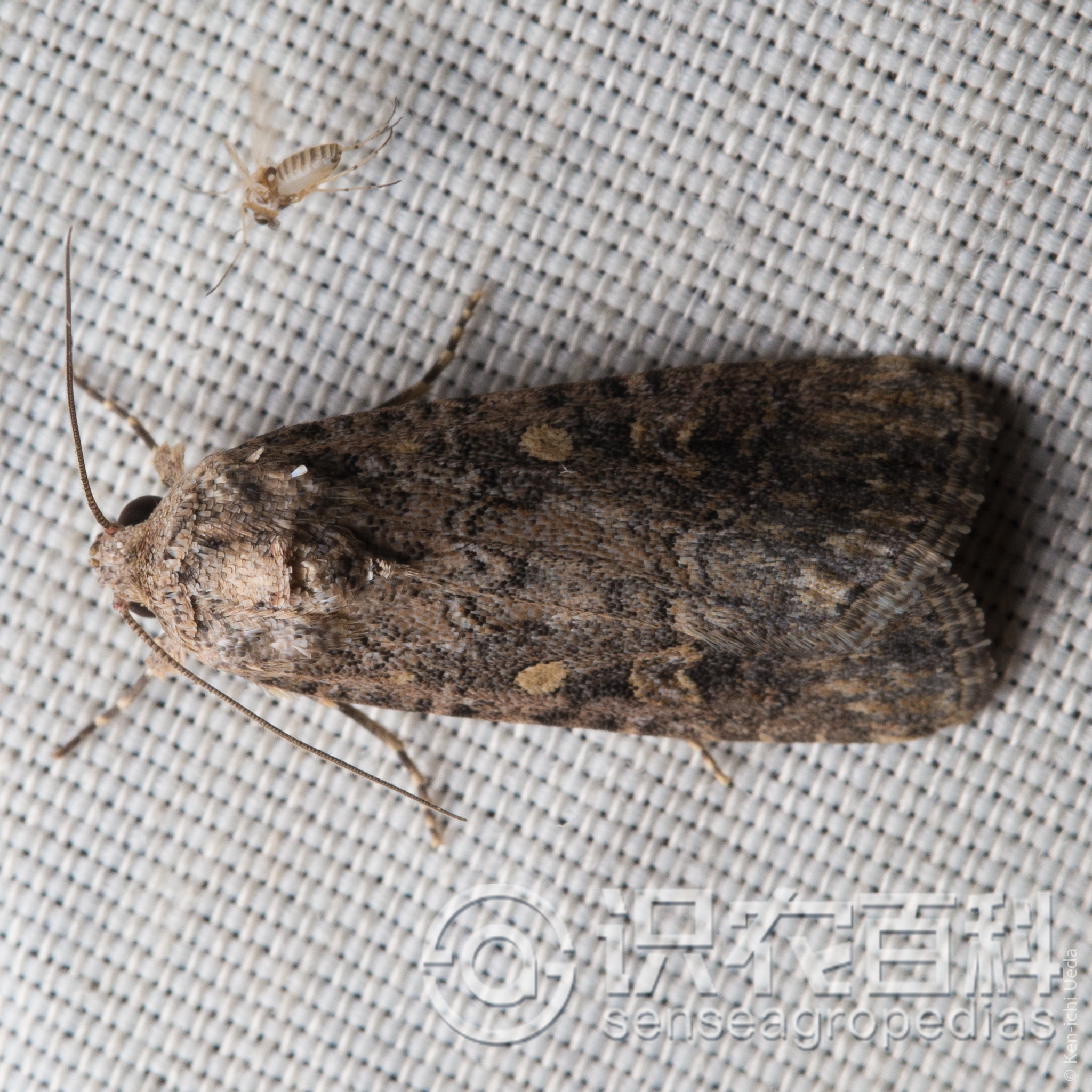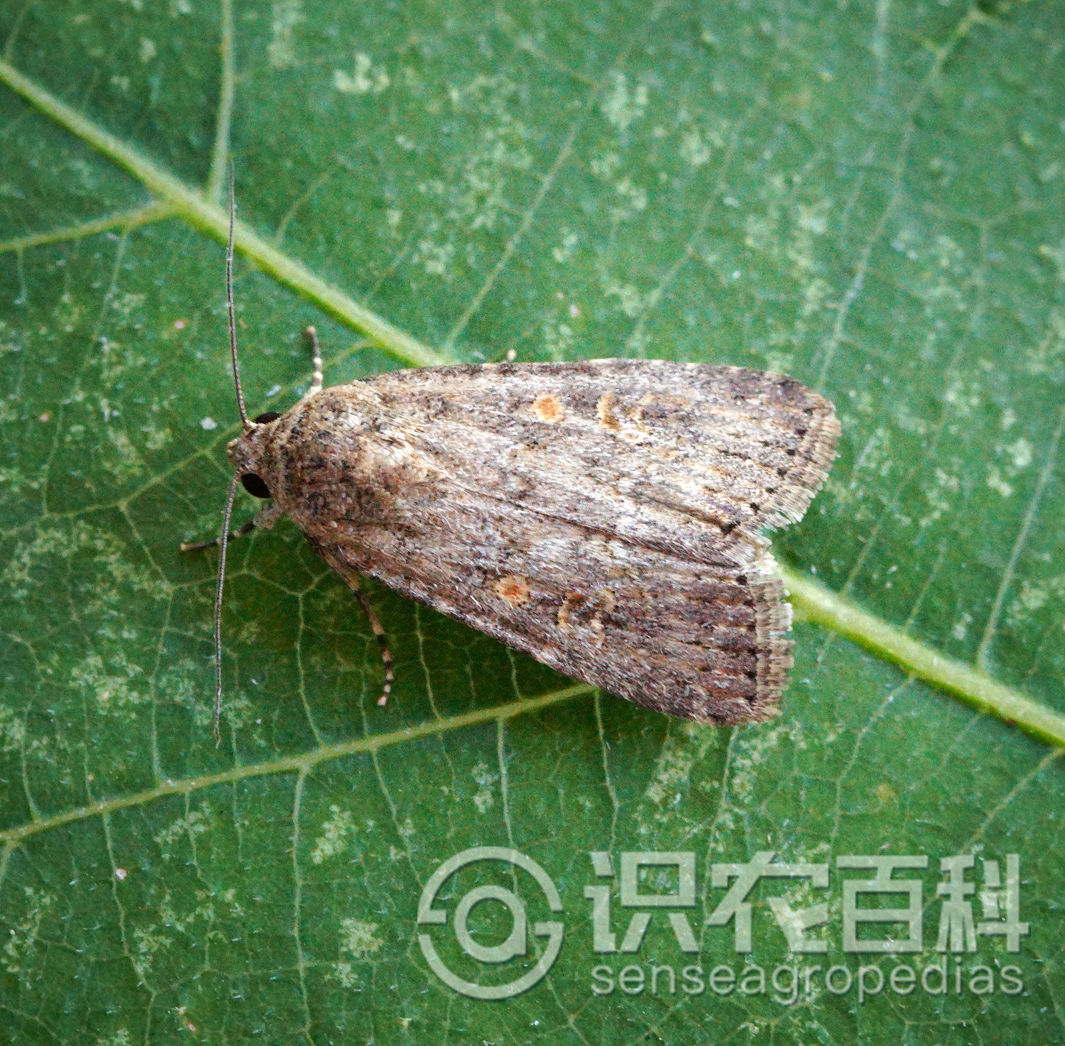 成蟲體長10—14毫米, 翅展25—30毫米,蟲體和前翅灰褐色,前翅外緣線由1列黑色三角形小斑組成,腎形紋與環紋均黃褐色。卵圓饅頭形,卵粒重疊,形成1-3層卵塊,有白絨毛覆蓋。幼蟲體色多變,一般為綠色或暗綠色,氣門下線黃白色,兩側有黃白色縱帶紋,有時帶粉紅色,各氣門后上方有1個顯著白色斑紋。腹足4對。蛹體長1厘米左右,黃褐色。