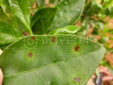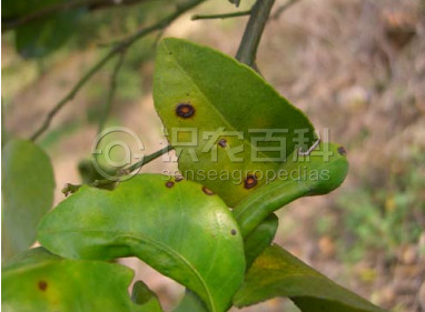 以為害年橘、甜橙葉片為主。初期葉面散生具黃色暈環(huán)的圓形褐色小點(diǎn),后病斑擴(kuò)大,邊緣稍隆起,深褐色,中部黃褐色,微凹;后期病斑中部生出污綠色霉?fàn)钗铮瑸椴≡稚咦庸:玩咦?,病斑圓形或近圓形,穿透葉的兩面,其外圍無(wú)黃色暈圈,病、健組織界限明顯。這是本病與潰瘍病和棒孢霉斑病的區(qū)別點(diǎn)。發(fā)生嚴(yán)重時(shí),葉片脫落,枝條光禿。