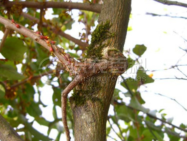 以吸器盤吸在柑橘的大枝條上,借此吸取樹體的養分、水分,導致樹體變弱,嚴重時,植株枯死。