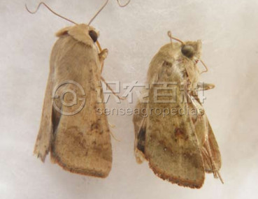 棉鈴實夜蛾成蟲體長1520毫米,雌蟲體淺灰褐色或黃褐色,雄蟲體灰綠色;復眼灰綠色較深,觸角絲狀;頭、胸背面被長絨毛,腹背面絨毛較短,淺灰綠色;腹面胸部被淺黃白色長絨毛;前翅灰綠色,腎形紋、環形紋和各橫線不清晰,內橫線波形紋斷續,中橫線由腎形紋下斜伸至后緣,末端達到環形紋正下方,外橫線斜向后伸達腎形紋正下方。煙實夜蛾與棉鈴實夜蛾的形態及色澤極為相似,田間常一起為害,較難區分。較明顯的不同是:前者成蟲的復眼為灰綠色,后者為黑色。