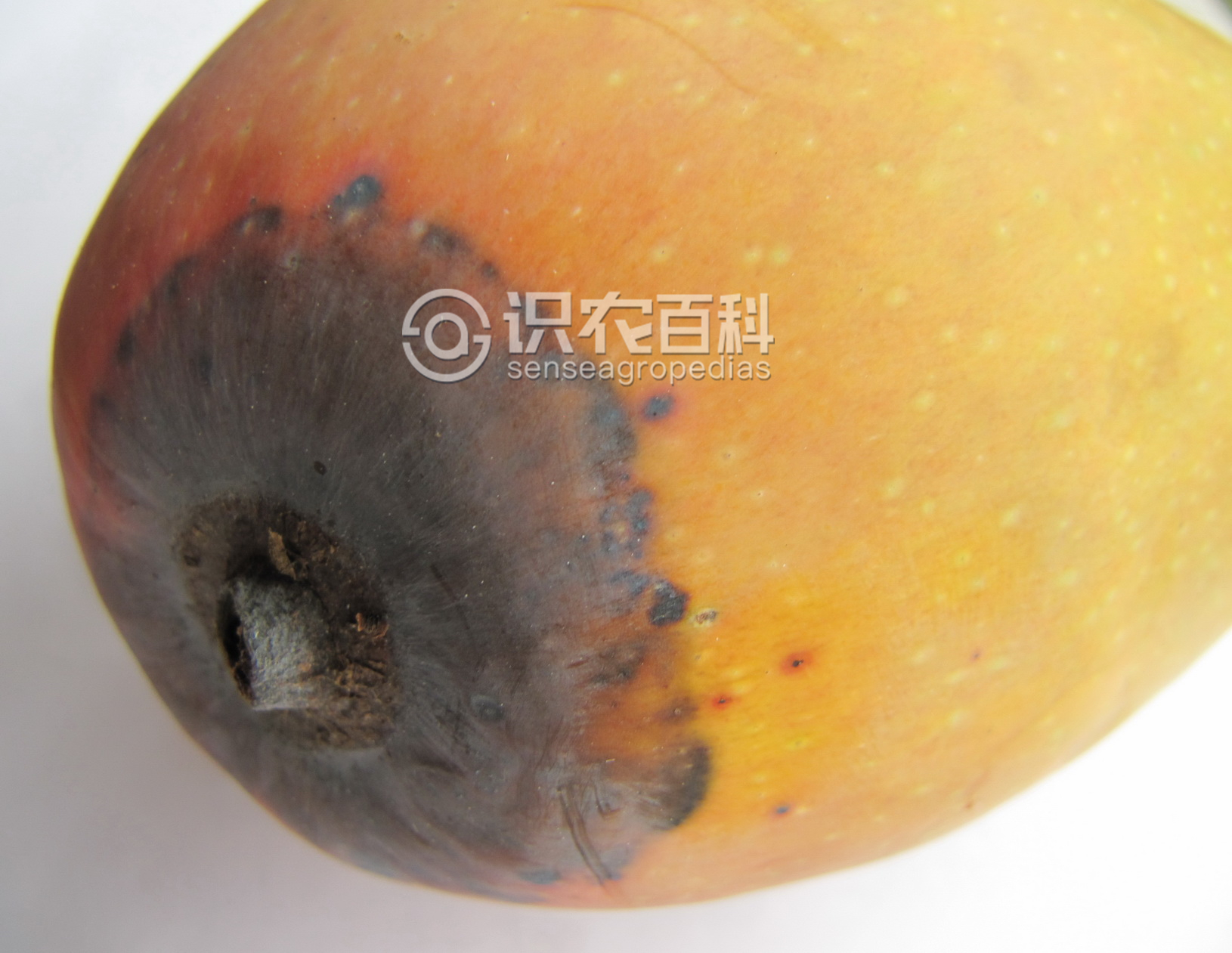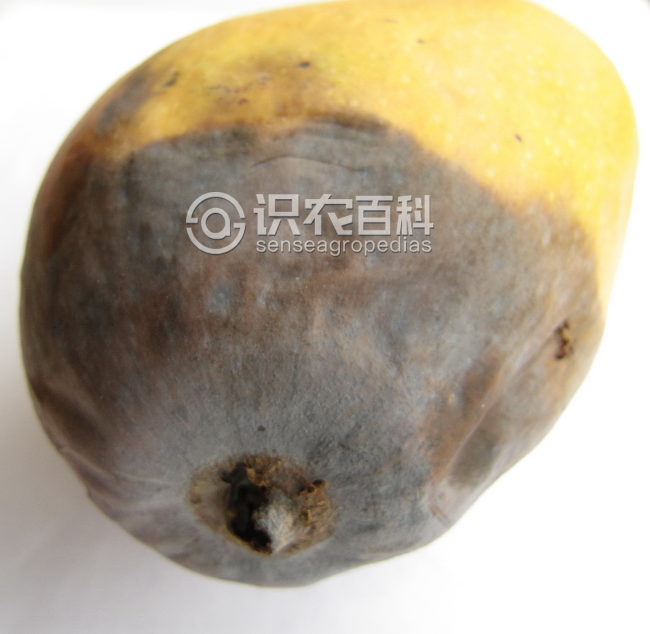 芒果蒂腐病主要為害芒果果實(shí),發(fā)病部位最初在果蒂周?chē)瘸霈F(xiàn)褐色斑點(diǎn),繼而迅速擴(kuò)展至整個(gè)果蒂的果皮變褐、腐爛、滲出黏液。對(duì)貯藏及運(yùn)輸影響甚大。