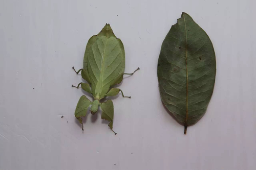 葉?(xiu),又稱葉子蟲。竹節蟲目,葉?偽裝成樹葉,不但可以將身體的紋脈偽裝成葉子的葉脈,六條腿和身體邊緣居然能像枯葉一樣“枯萎”它體色多為綠色或褐色,跟所棲息生活環境中的植物葉片顏色相似,因而不易被天敵動物發現,得以逃避侵害,