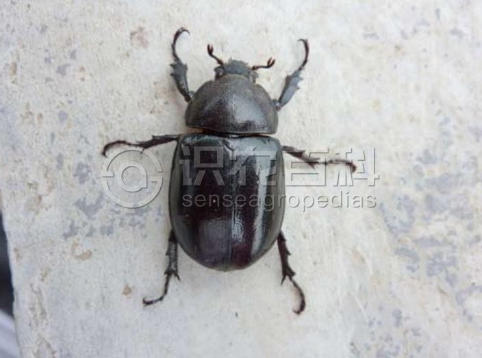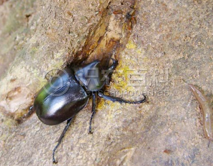 成蟲(chóng)體長(zhǎng)30-45毫米,近卵圓形,黑褐色,有光澤;雄成蟲(chóng)頭部額頂有一粗大的角狀突起,向上翹,向后彎,末端分叉;前胸背板有一前伸的角狀突,末端或分二叉;雌蟲(chóng)體較小;頭、胸部均無(wú)角狀突起。卵呈卵圓形,長(zhǎng)約3毫米,初產(chǎn)時(shí)乳白色,后變污黃色。老熟幼蟲(chóng)體長(zhǎng)50-60毫米,圓筒形,黃白色,頭部黑褐色,體常彎曲,密生細(xì)毛,后端各體節(jié)較長(zhǎng),光滑無(wú)皺紋。蛹體長(zhǎng)35-55毫米,黃白色,將羽化時(shí)變成紅色。