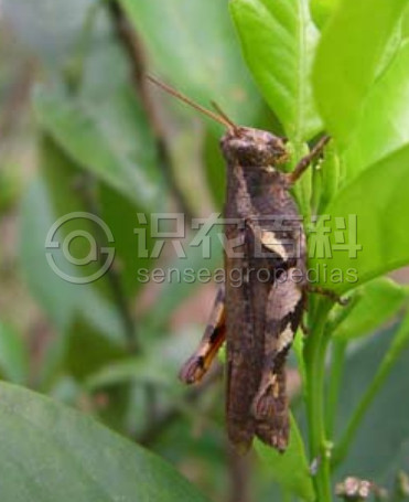 成蟲蟲體暗褐色、紅褐色或黃褐色。雌蟲體長24-27毫米,雄蟲體長18-21.5毫米;頭、胸部密布圓形小瘤突;面顏隆起,中縱溝明顯;前胸背板中隆線明顯,有3條橫溝,且切斷中隆線,其后一條橫溝在背板中部,后胸兩側各有一長形白色斜斑紋;前翅發達,暗褐色,超過后腿節頂端,翅端部橫脈斜;后翅透明,翅頂煙褐色;后腿節發達,外側具完整白色斜斑2個,近端另有1個小斑;后脛節紅褐色;善彈跳。
