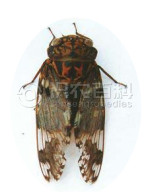 成蟲體長35-38mm,體型粗短;頭胸部暗綠色至暗黃褐色,具黑色斑紋;腹部黑色,每節(jié)后緣暗綠或暗褐色;復(fù)眼大,單眼3個,紅色,呈三角形排列;觸角剛毛狀,前胸寬于頭部,近前緣兩側(cè)突出;翅透明,翅脈暗褐色,前翅有不同濃淡暗褐色云狀斑紋,斑紋不透明,后翅黃褐色。雄蟲有鳴器,雌蟲無。卵梭形,乳白色漸變黃,頭端比尾端略尖。