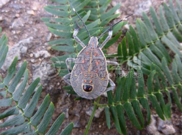 成蟲體長(zhǎng)18-22毫米,寬8-11毫米;體稍寬大,體背棕黑褐色,頭端至小盾片中部具1條黃白色或黃色細(xì)縱脊;前胸背板、小盾片、前翅革質(zhì)部布有不規(guī)則細(xì)碎黃白色凸起斑紋,靠后端中間黃白色斑稀少,形成1個(gè)近圓形棕黑褐色大斑;腹部側(cè)接緣節(jié)間具小黃斑;前翅膜質(zhì)部黑色或棕黑褐色;頭部稍狹長(zhǎng),前尖,頭兩側(cè)有黃白色細(xì)脊邊;復(fù)眼黑色;觸角5節(jié),黑色,絲狀,第五節(jié)基部1/3淡黃白色或黃色;喙4節(jié),淡黃色,末節(jié)黑色,喙縫暗褐色;足基節(jié)間褐黑色,跗節(jié)端部黑褐色,具1對(duì)爪;后足基節(jié)旁有揮發(fā)性臭腺的開口。卵近圓形,初產(chǎn)淡綠色,孵化前灰褐色,具頂蓋,蓋緣具齒狀。初孵若蟲圍在卵殼四周,后分散取食,各齡體色不一,形狀不同,三齡期始,顯前尖削后渾圓的梨形;老齡若蟲體長(zhǎng)約19毫米,似成蟲。