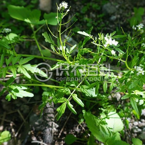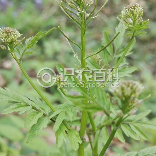 高20-60厘米。莖直立,不分枝或有時(shí)上部分枝,表面有溝棱,有少數(shù)短柔毛或無(wú)毛,著生多數(shù)羽狀復(fù)葉。基生葉葉柄長(zhǎng)1-3厘米,兩緣通常有短柔毛,基部稍擴(kuò)大,有1對(duì)托葉狀耳,小葉2-8對(duì),頂生小葉卵形,長(zhǎng)6-13毫米,寬4-8毫米,邊緣有不整齊鈍齒狀淺裂,基部楔形,小葉柄顯著,側(cè)生小葉與頂生的相似,自上而下漸小,通常生于最下的1-2對(duì)近于披針形,全緣,都有顯著的小葉柄;莖生葉有柄,基部也有抱莖線形彎曲的耳,長(zhǎng)3-8毫米,頂端漸尖,緣毛顯著,小葉5-8對(duì),頂生小葉卵形或卵狀披針形,側(cè)生小葉與之相似,但較小;最上部的莖生葉小葉片較狹,邊緣少齒裂或近于全緣;全部小葉散生短柔毛,有時(shí)無(wú)毛,邊緣均有緣毛。總狀花序頂生和腋生,花多數(shù),形小,直徑約2毫米,果期花序極延長(zhǎng),花梗纖細(xì),長(zhǎng)2-6毫米;萼片長(zhǎng)橢圓形,長(zhǎng)約2毫米;花瓣白色,狹長(zhǎng)橢圓形,長(zhǎng)2-3毫米,基部稍狹;雌蕊柱狀,無(wú)毛,花柱極短,柱頭較花柱稍寬。長(zhǎng)角果狹條形而扁,長(zhǎng)20-28毫米;果瓣無(wú)毛,成熟時(shí)自下而上彈性開(kāi)裂;果梗直立開(kāi)展或水平開(kāi)展,長(zhǎng)10-15毫米,無(wú)毛。種子橢圓形,長(zhǎng)約1.3毫米,邊緣有極狹的翅。 花期4-6月,果期5-7月。