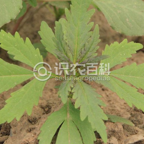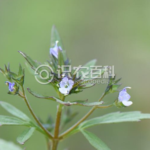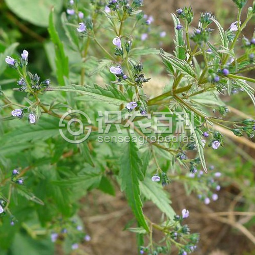 一年生草本,基部有時木質化,高0.3-1米,呈金字塔形分枝。莖四棱形,紫色,灰紫黑色或紫綠色,被疏柔毛或微柔毛,以節上較多。葉柄長0.7-2厘米,紫色或紫綠色,有溝,具狹翅,被疏長硬毛;葉片紙質或近膜質,三角形或近卵形,3深裂,稀不裂或5裂,裂片披針形,邊緣具粗鋸齒或重鋸齒,中間的裂片長2.5-4.7厘米,寬0.8-1.5厘米,無柄,兩側的裂片長2-3.5厘米,寬0.7-1.2厘米,無柄或幾無柄,基部不對稱,下延,葉片上面綠色或紫綠色,被疏微柔毛或幾無毛,下面略淡,無毛,中肋隆起,明顯。花序為由松散具長梗的聚傘花序所組成的圓錐花序;苞葉與莖葉同形,變小;小苞片微小,線形,長約1毫米,具緣毛;花梗短,長1-2.5毫米,與總梗被疏腺毛。花萼鐘形,長約2毫米,外面被乳頭狀突起及腺毛,內而無毛,具10脈,其中5肋明顯隆起,中間脈不明顯,萼齒5,近整齊,三角形,漸尖,長約1毫米或略短,邊緣具緣毛;果時花萼增大。花冠藍色或紫藍色,冠筒內藏或略長于花萼,外面無毛,冠檐二唇形,外面被腺毛,上唇2裂,長圓狀卵形或卵形,下唇略大,3裂,中裂片近圓形,側裂片與上唇裂片近同形。雄蕊4,前對能育,著生于下唇基部,花芽時內卷,花時向后伸長,自上唇裂片間伸出,花絲細弱,無毛,伸出雄蕊約1/2,花藥2室,室叉開,縱裂,成熟后貫通為1室,后對為退化雄蕊,著生于上唇基部,線形或幾無。花柱細弱,略超出雄蕊,先端不相等2淺裂,前裂片細尖,后裂片短或不明顯。花盤環狀,具相等淺裂片。小堅果倒卵狀三棱形,背面具網狀皺紋,腹面具棱,兩側平滑,合生面大,高達果長1/2以上。花期8-9月,果期9-10月。