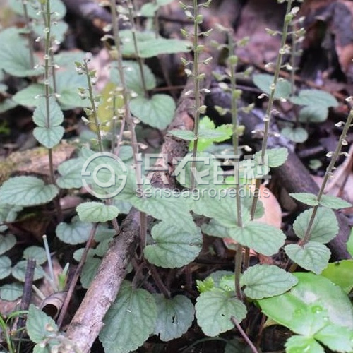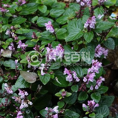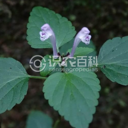 多年生草本;根莖短,向下生出多數簇生的纖維狀根,向上生出1至多數莖。莖高12-28厘米,上升直立,四棱形,粗約1-1.2毫米,通常帶暗紫色,被微柔毛,尤以莖上部及沿棱角為密集,不分枝或多分枝。葉草質至近堅紙質,心狀卵圓形或圓狀卵圓形至橢圓形,長1.5-2.6(3)厘米,寬1.2-2.3厘米,先端鈍或圓,基部圓形、淺心形至心形,邊緣密生整齊圓齒,兩面被微柔毛或糙伏毛,尤以下面為甚;葉柄長0.4-1.4(2.8)厘米,腹平背凸,密被微柔毛。花對生,在莖或分枝頂上排列成長4-8(12)厘米的總狀花序;花梗長2.5-3毫米,與序軸均被微柔毛;最下一對苞片葉狀,卵圓形,長達1.7厘米,邊緣具圓齒,其余苞片均細小,卵圓形至橢圓形,長3-6毫米,寬1-2.5毫米,全緣,無柄,被微柔毛?;ㄝ嚅_花時長約2.5毫米,被硬毛及微柔毛,果時十分增大,盾片花時高約1.5毫米,果時豎起,增大一倍?;ü谒{紫色,長1.4-1.8厘米,外疏被微柔毛,內面僅唇片被短柔毛;冠筒前方基部膝曲,其后直伸,向上逐漸增大,至喉部寬約4.5毫米;冠檐2唇形,上唇盔狀,內凹,先端微缺,下唇中裂片圓狀卵圓形,兩側中部微內縊,先端微缺,具深紫色斑點,兩側裂片卵圓形。雄蕊4,二強;花絲扁平,中部以下具小纖毛?;ūP肥厚,前方隆起;子房柄短。花柱細長。子房光滑,4裂。成熟小堅果栗色或暗褐色,卵形,長約1毫米,徑不到1毫米,具瘤,腹面近基部具一果臍?;ü?-6月。
