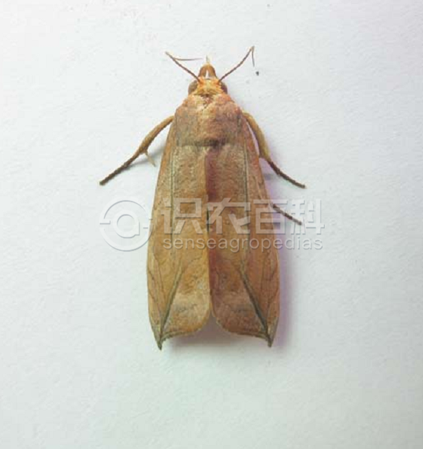 (1)成蟲(chóng):頭部及頸板赤橙色;胸部赭褐色;腹部灰黃色,背面帶褐色;前翅褐色帶紫,各橫線弱,波浪形,中脈黑棕色,一黑棕線自頂角內(nèi)斜至3脈近基部;后翅黃色,端區(qū)微帶褐色。