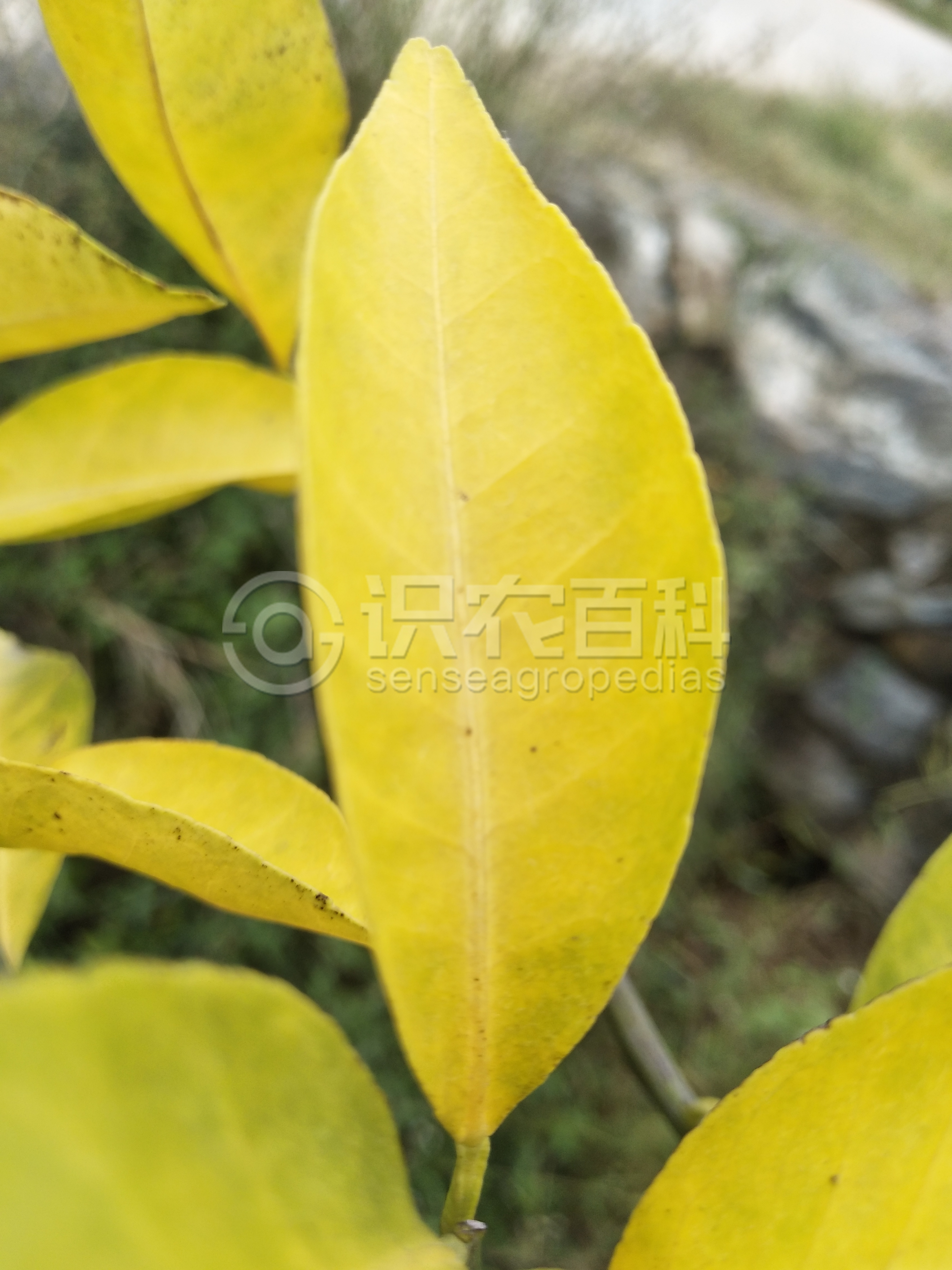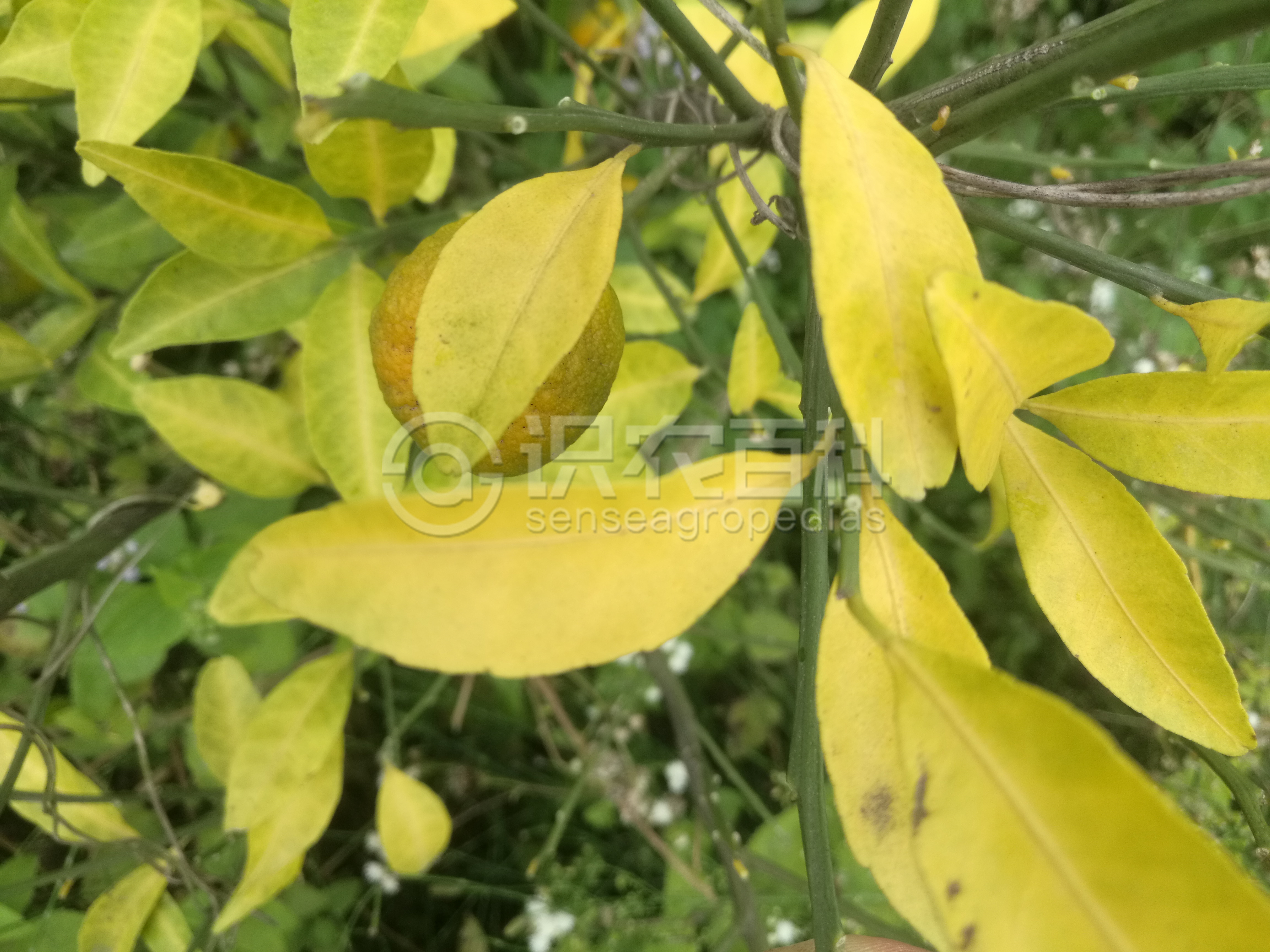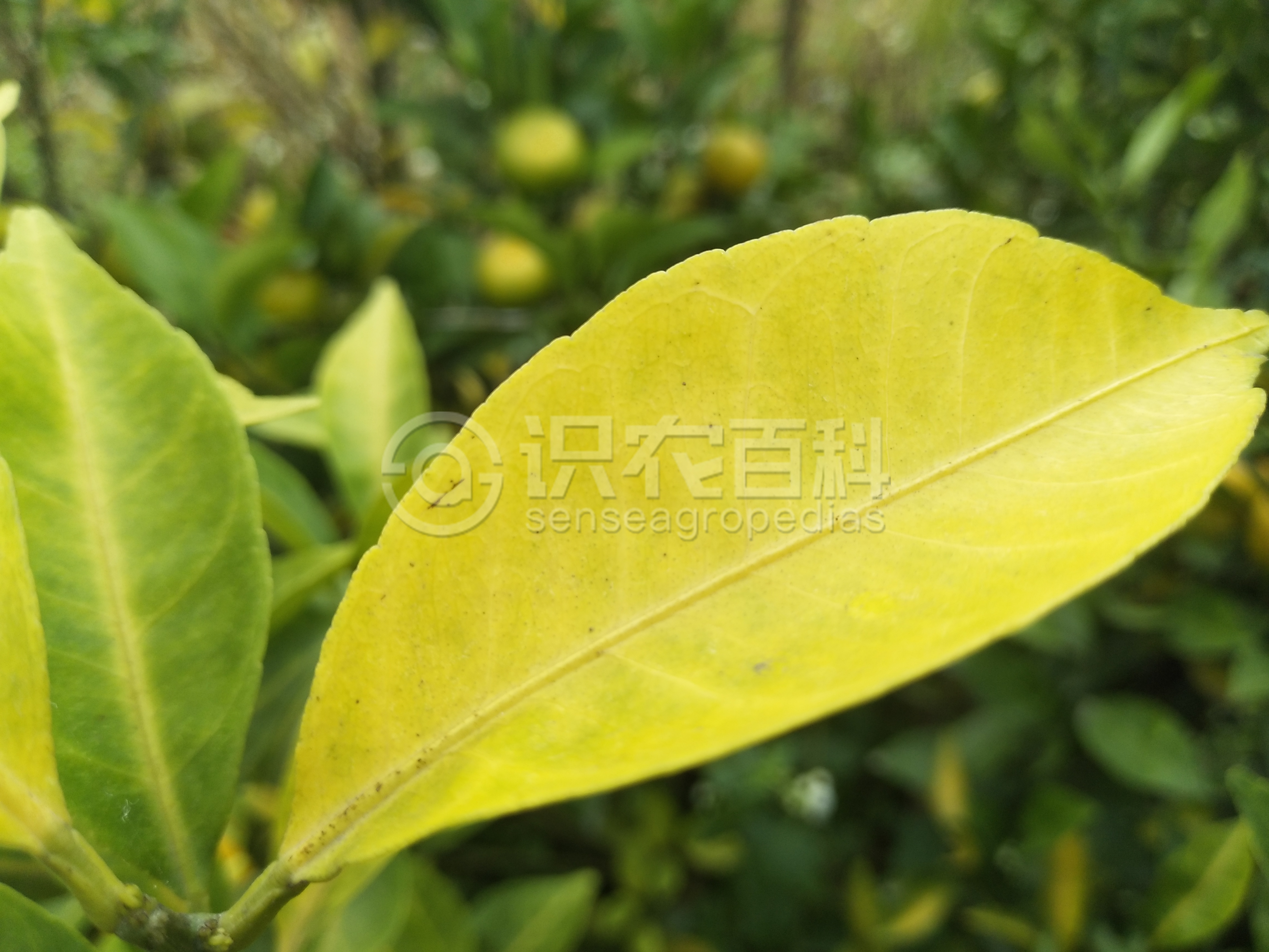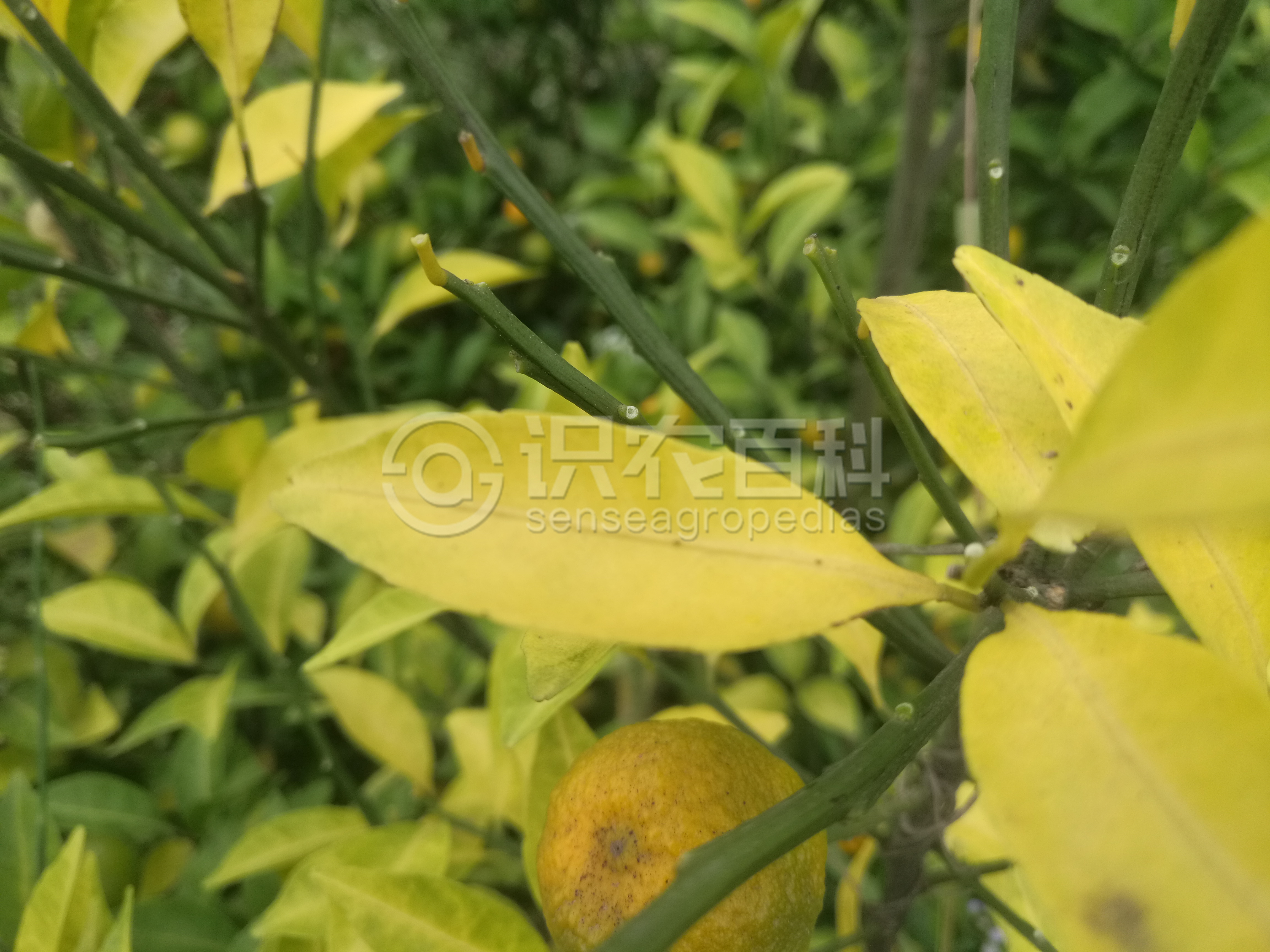 柑橘缺氮時,新梢纖細,葉小而薄,淡綠色至淡黃色,葉片硬直或叢生,或提早脫落,落花落果明顯。嚴重缺氮時,新梢全部發黃,花少或無花。缺氮初期,一般是樹冠下部的老葉先發生不同程度的黃化,部分綠葉表現出不規則的黃綠交織的雜斑,隨后全部葉片黃化脫落。長期缺氮時,植株矮小,葉均勻黃化,小枝枯死,花少果小,早熟,果味差。
