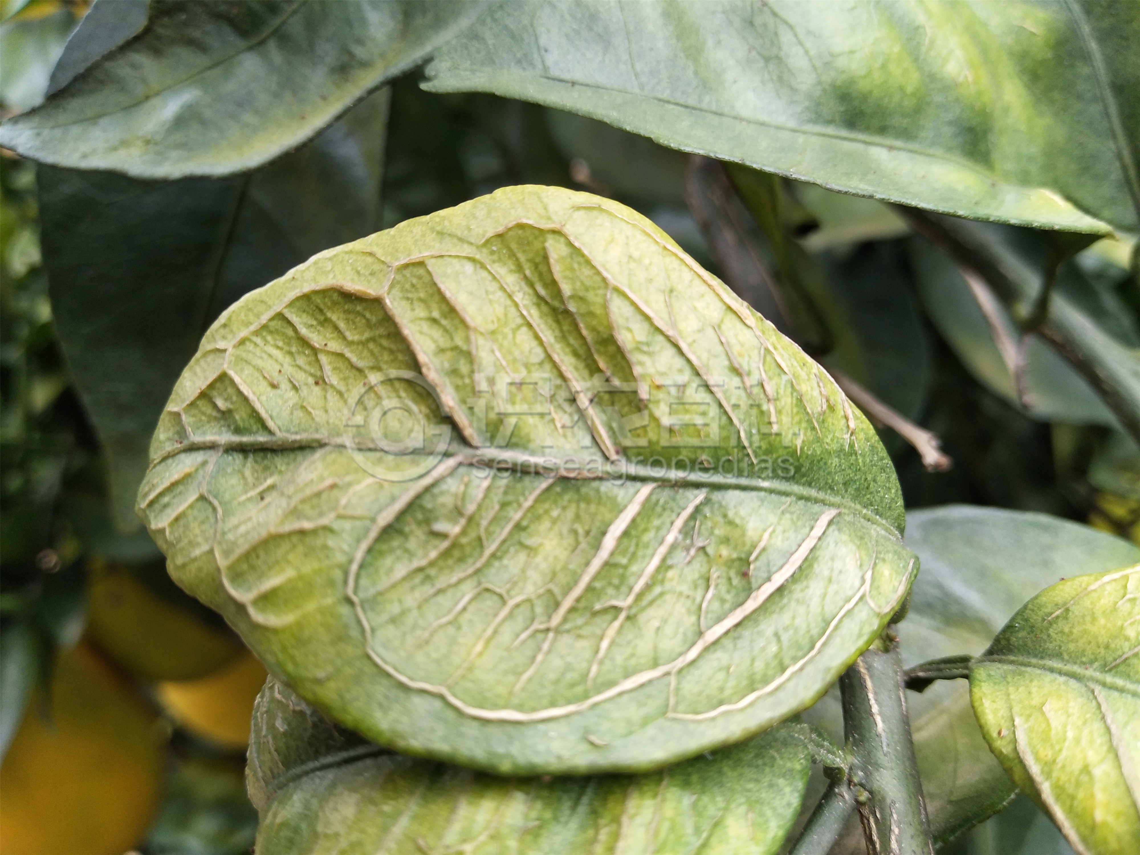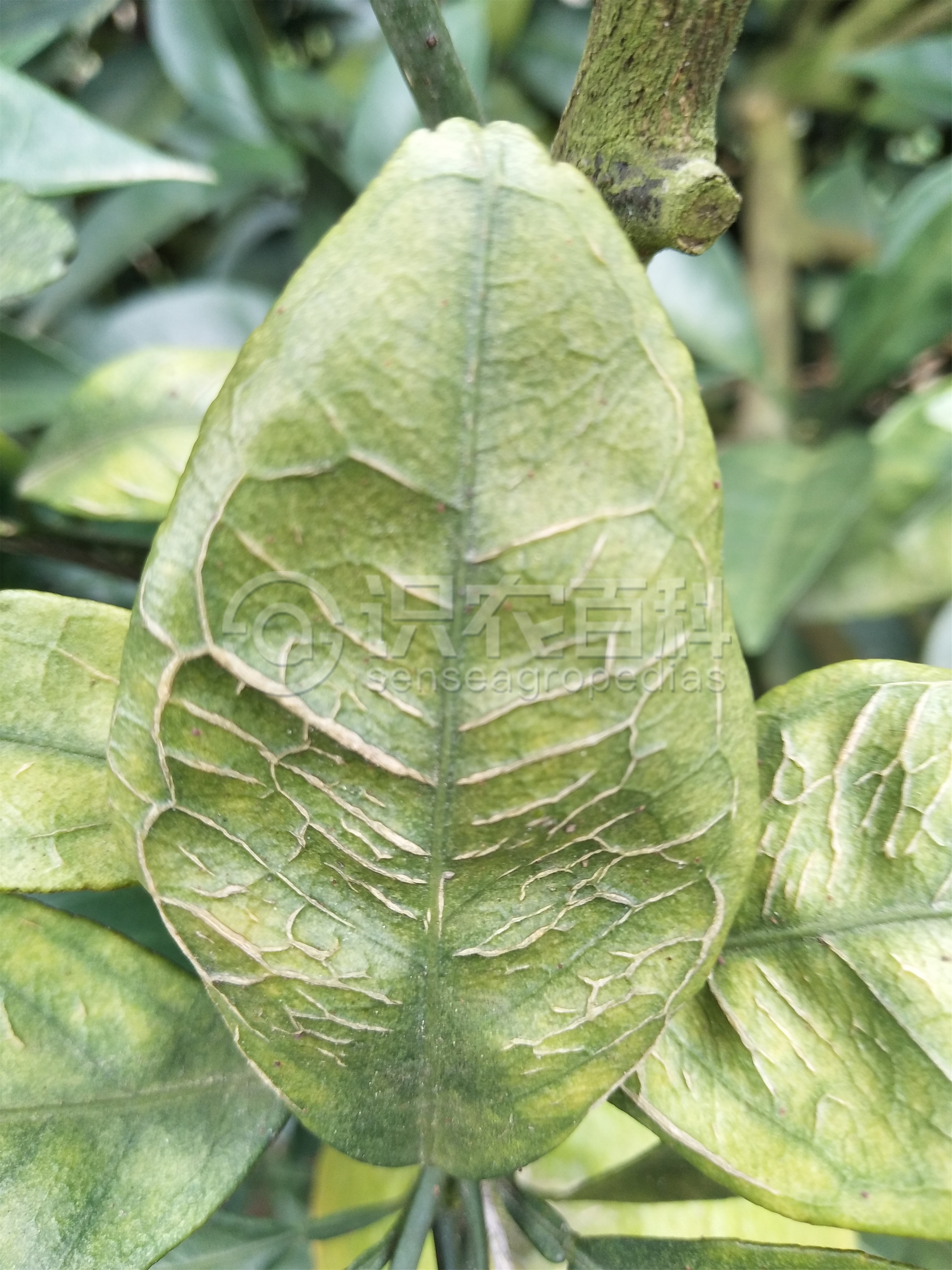 成葉和老葉暗淡黃化,無光澤,向后卷曲,葉肉較厚,主、側(cè)脈木質(zhì)栓化,嚴(yán)重時(shí)開裂,葉肉有暗褐色斑點(diǎn);嫩葉出現(xiàn)黃色不定形的水漬狀斑點(diǎn),有時(shí)在葉背主脈基部有黑色水漬斑點(diǎn),葉片扭曲。嚴(yán)重時(shí)葉片大量早落,枝條枯死。花畸形,柱頭外露。幼果果皮呈現(xiàn)乳白色微凸小斑,嚴(yán)重時(shí)斑點(diǎn)變黑下陷,中果皮和果心出現(xiàn)褐色的膠質(zhì)物,幼果大量脫落。殘留的果實(shí)小而堅(jiān)硬,畸形,皮粗汁少,種子敗育。