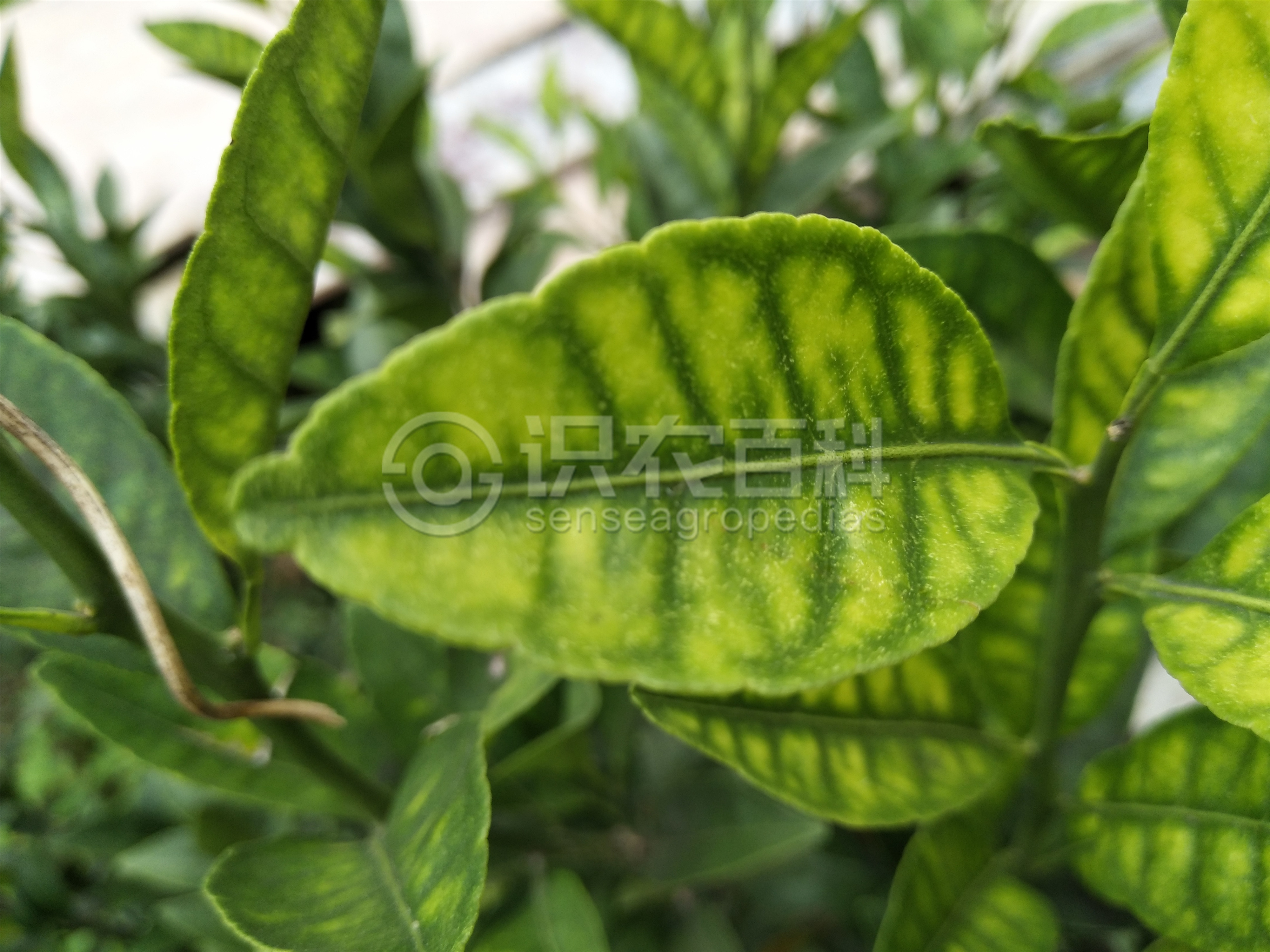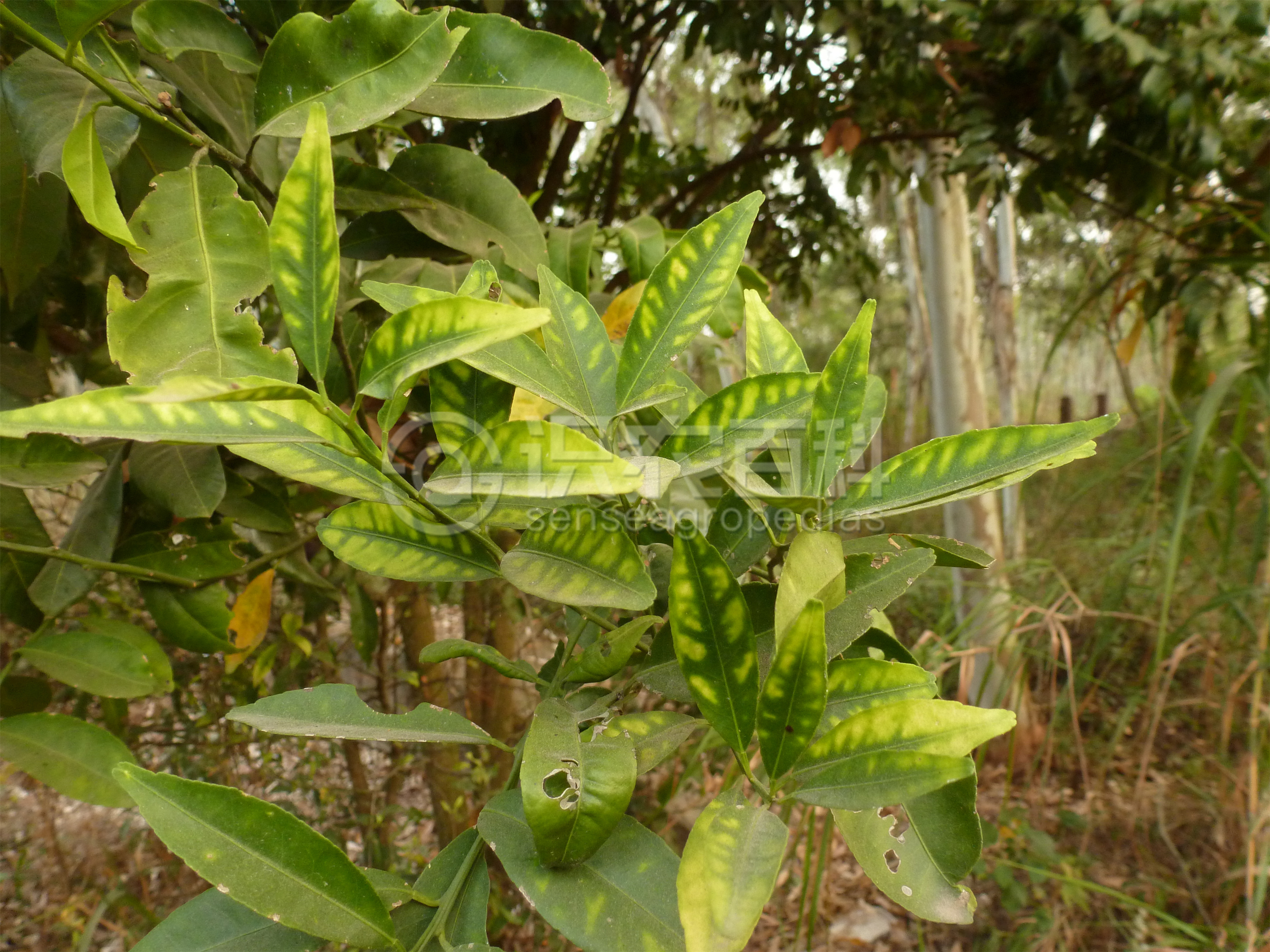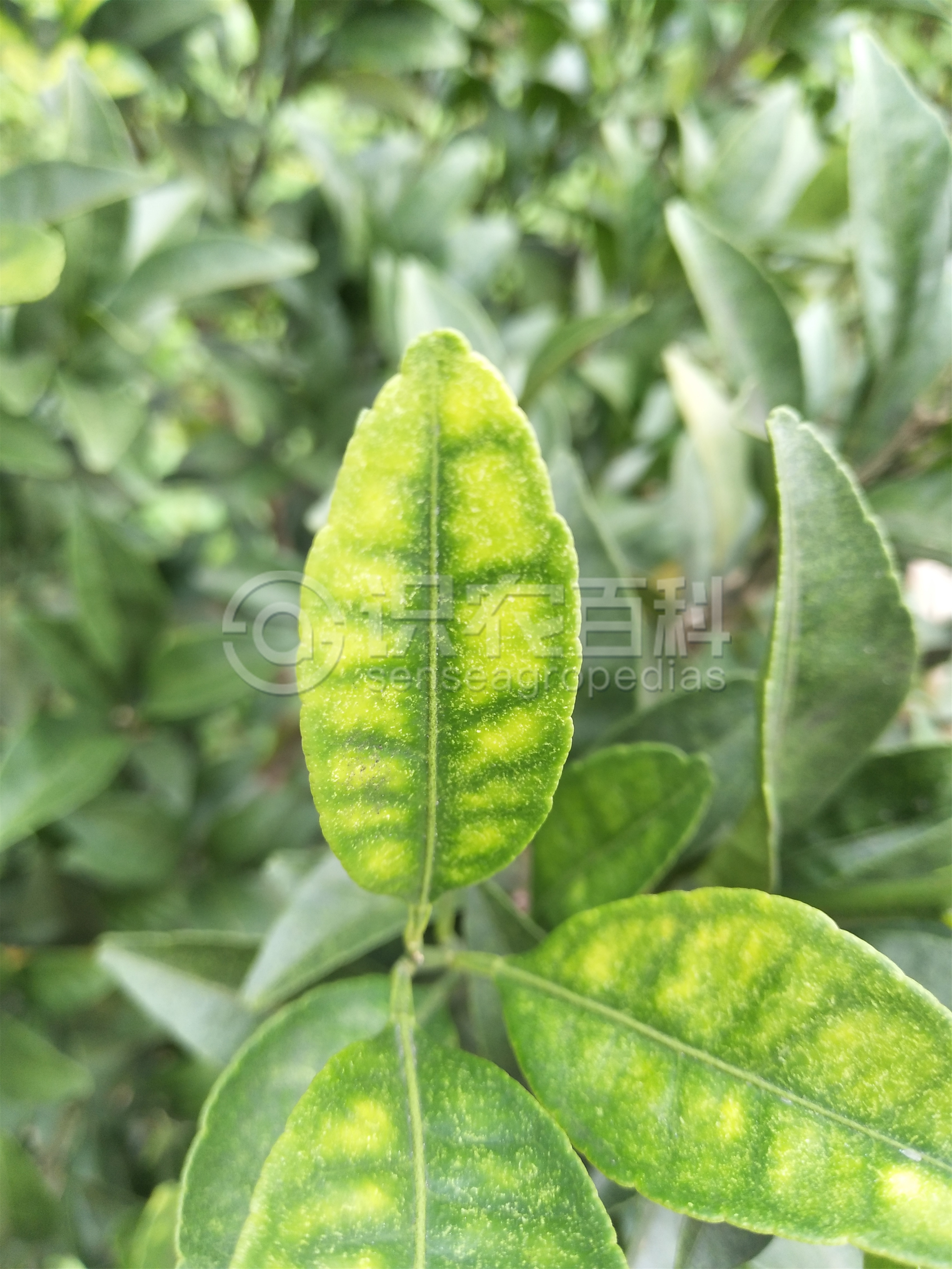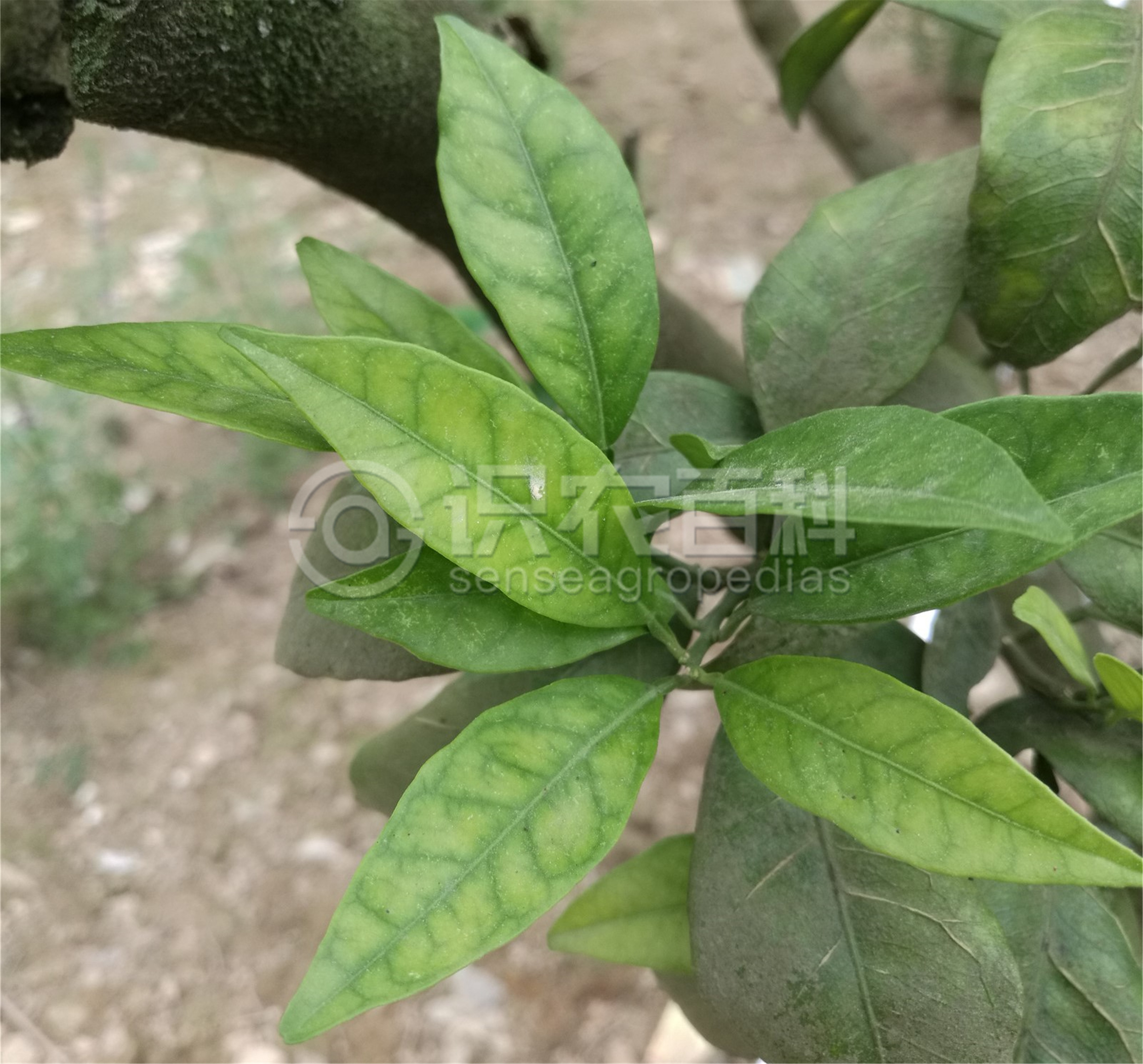 柑橘缺鋅時,病樹新梢上的葉片黃化,呈黃色或黃綠色,僅主、側脈附近為綠色,有的葉片則在綠色的主、側脈間呈現黃色或者淡黃色斑點,并隨著缺素嚴重程度而增加,黃色斑塊擴大。嚴重的新生葉變小、直立,新梢纖細,節間縮短,呈直立的矮叢狀,隨后小枝枯死。果實小、皮厚,味淡、汁少。
