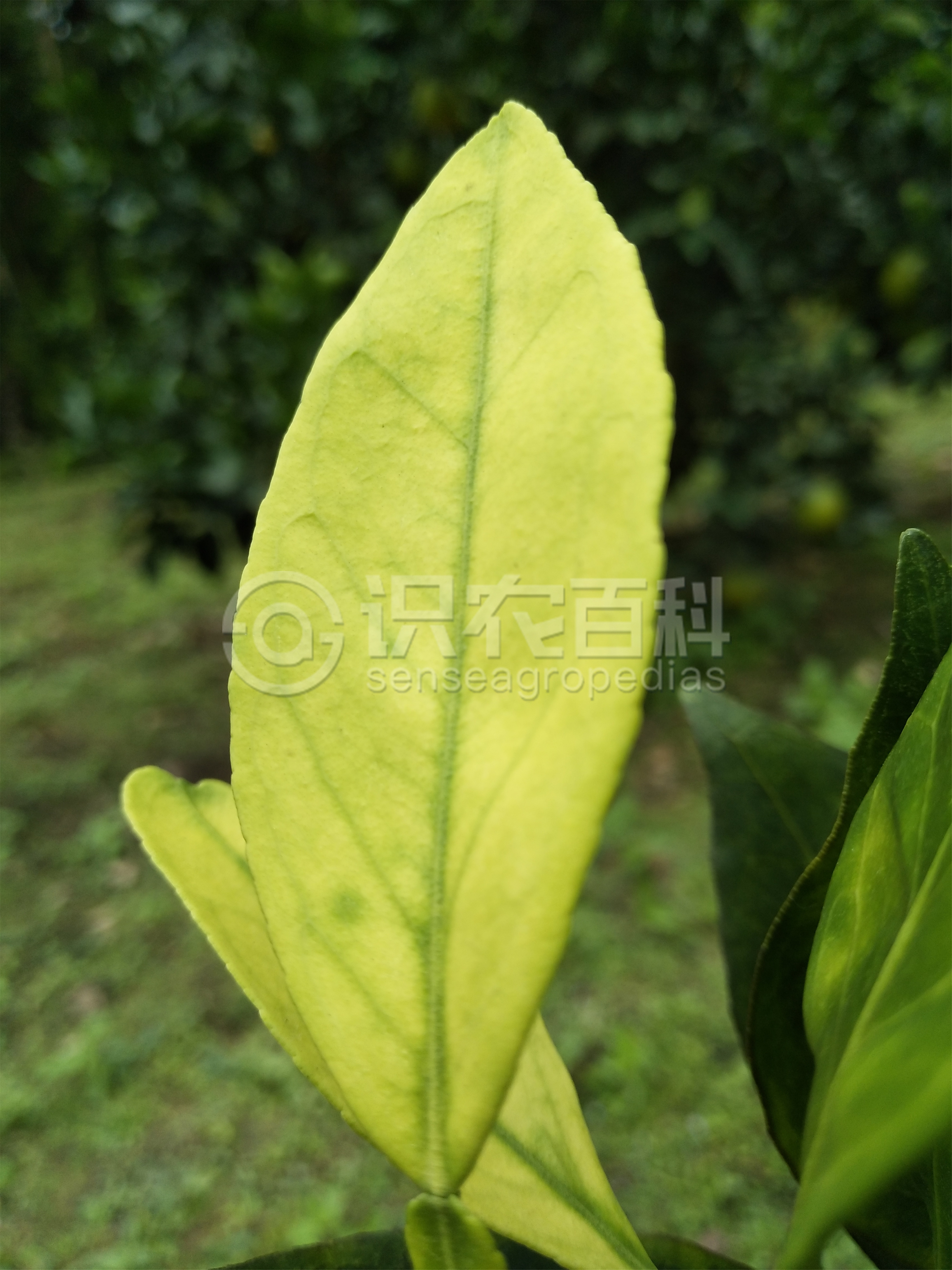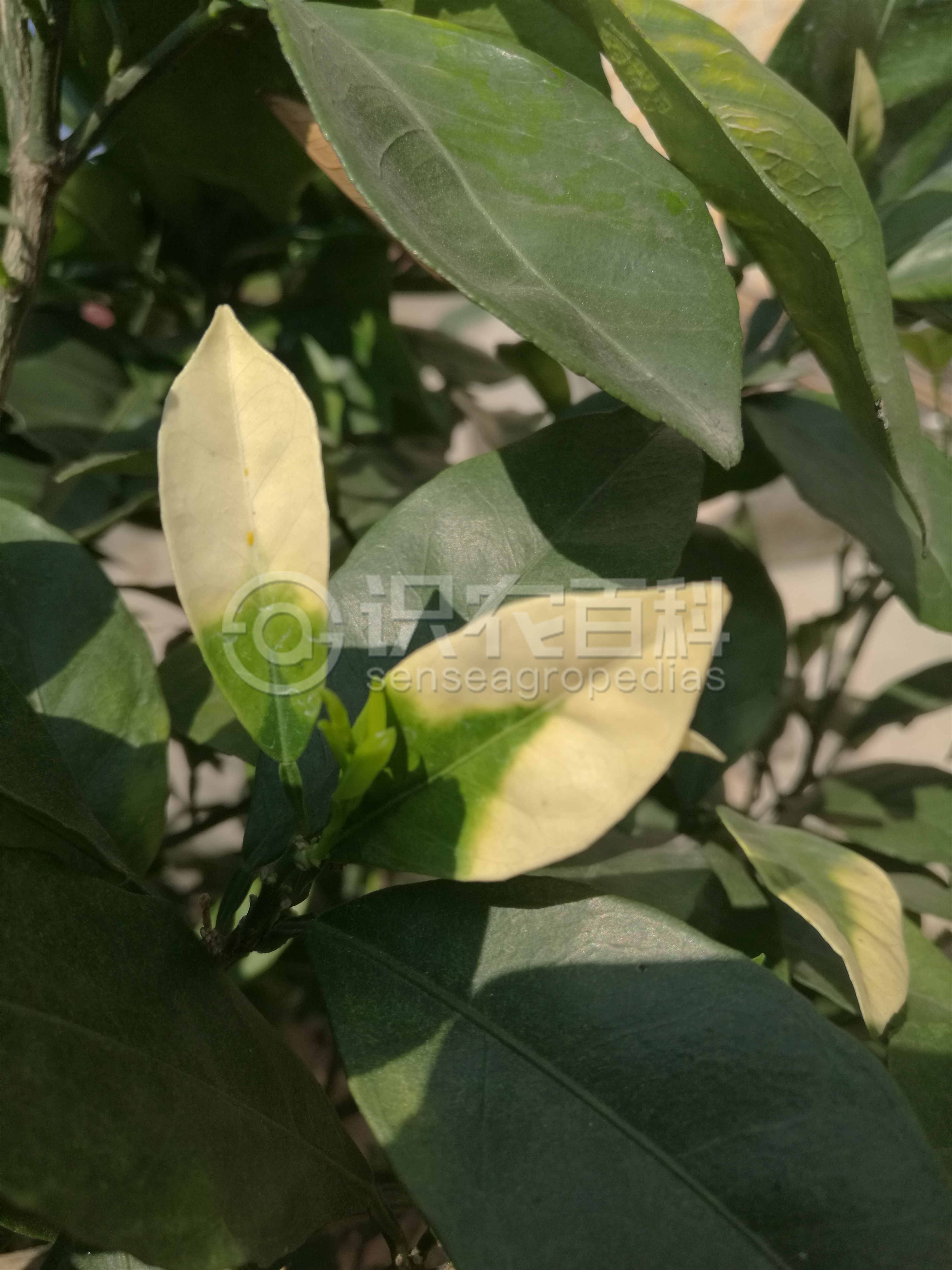 柑橘缺鐵時(shí)新梢葉片變薄,葉肉淡黃至黃白色,葉脈綠色,呈現(xiàn)明顯的綠色網(wǎng)狀葉脈,小枝頂端嫩葉表現(xiàn)更為明顯;而老葉仍保持綠色。嚴(yán)重缺鐵時(shí),葉片除了主脈近葉柄處為綠色外,葉片黃化,呈現(xiàn)出黃色至黃白色,失去光澤,葉緣變褐色和破裂,而后全株葉片均變?yōu)槌赛S色至白色,提早脫落。結(jié)果少,果皮黃白色,汁少,味淡。