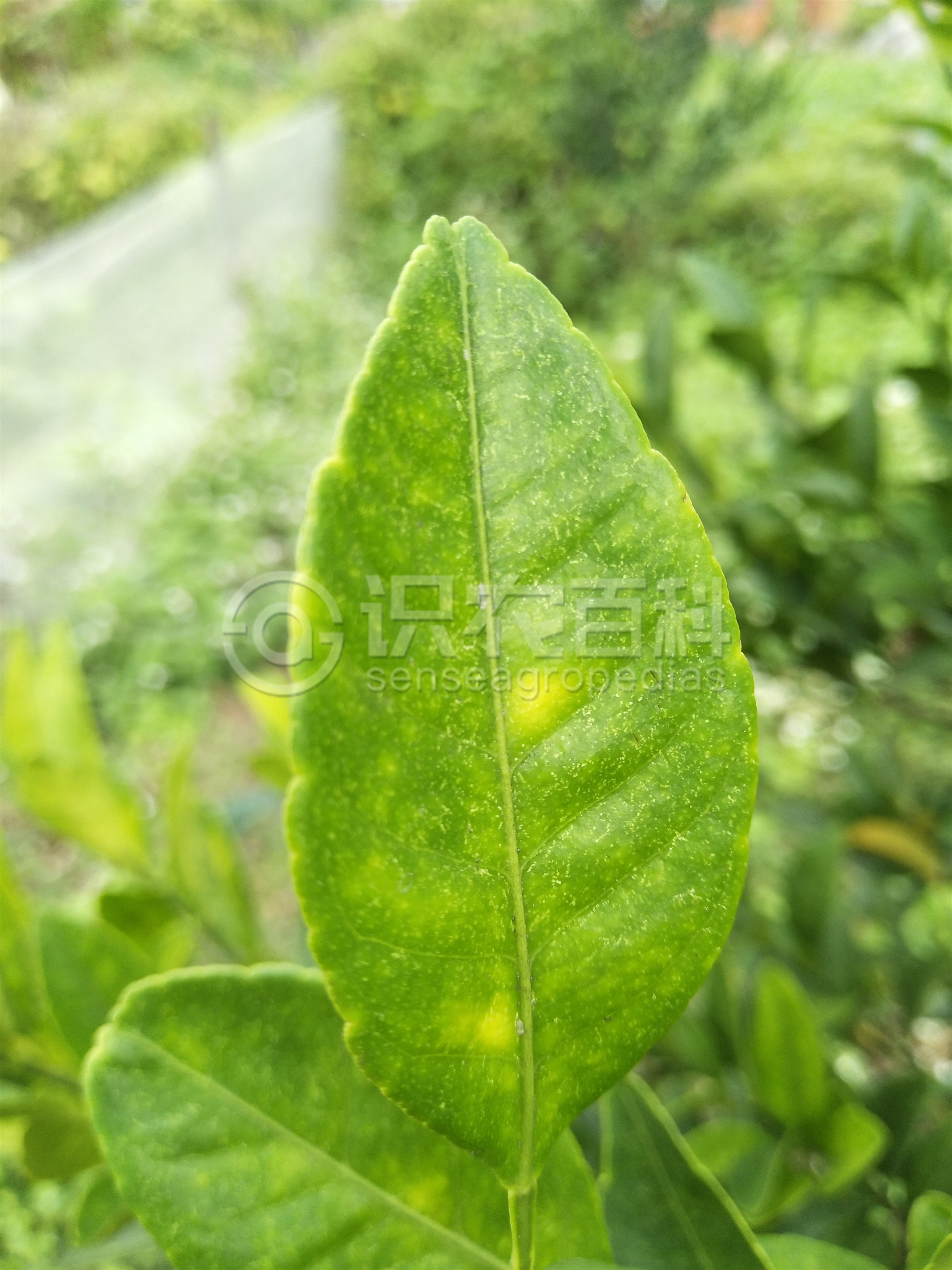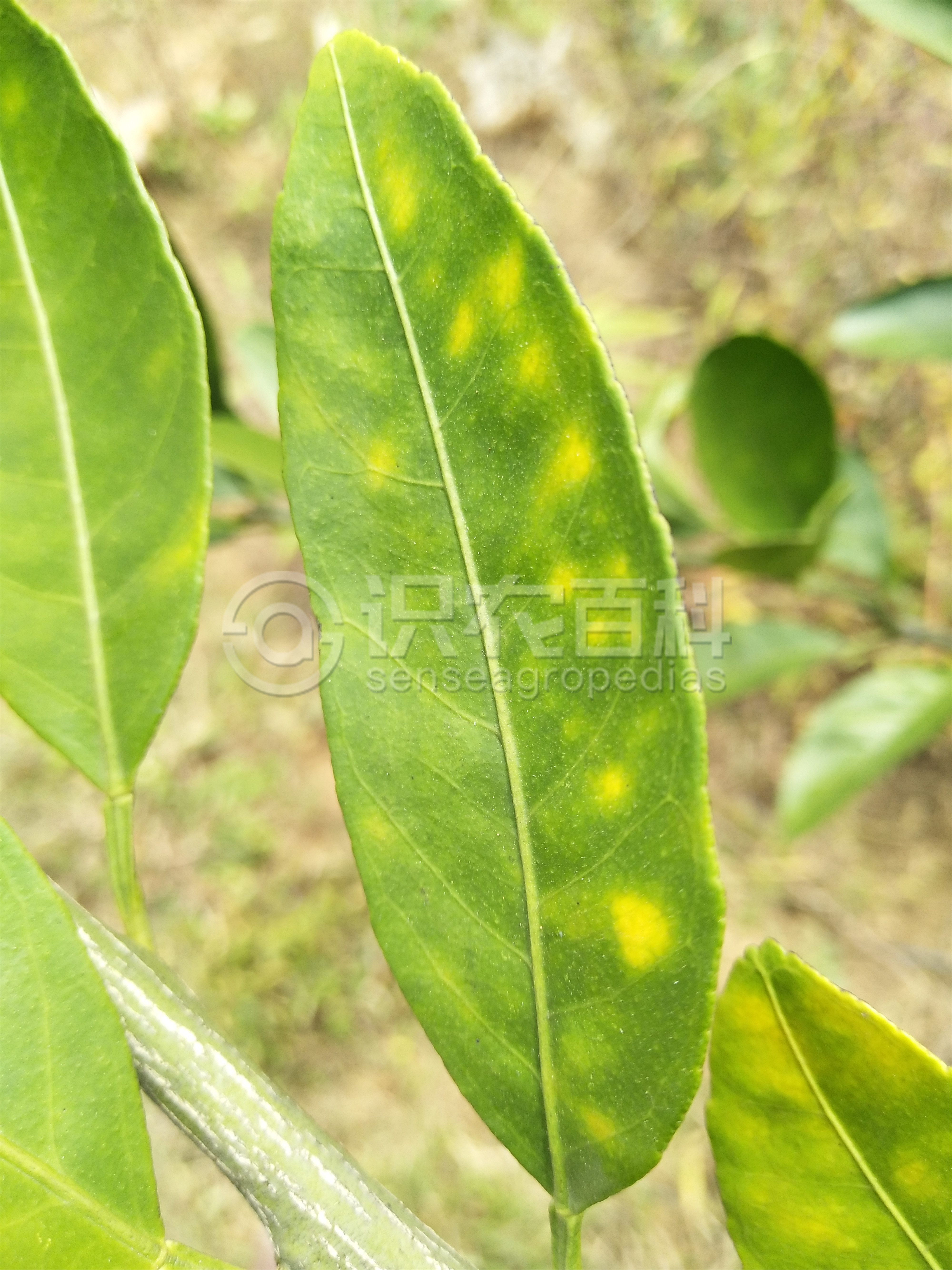 柑橘缺鉬較少發(fā)生,但是在新建果園會(huì)因土質(zhì)差而導(dǎo)致缺鉬。缺鉬時(shí),葉片上出現(xiàn)淡橙黃色的圓形或橢圓形黃斑,樹冠、葉片和果實(shí)病斑向陽面更普遍。夏季萌發(fā)的新葉葉脈會(huì)出現(xiàn)水漬狀斑,隨著葉片成長,病斑擴(kuò)大,在葉脈兩側(cè)呈現(xiàn)不規(guī)則排列。葉片正面病斑呈顯著黃色,病斑邊緣呈綠色,最后病斑變成褐色;葉片背面,病斑處從油綠褐色至銹褐色。葉表面的病斑光滑,葉背面病斑處稍腫起,且滿布膠質(zhì),嚴(yán)重時(shí)引起落葉。缺鉬嚴(yán)重時(shí),新葉淡黃色,并多縱卷向內(nèi)抱合,結(jié)果少。