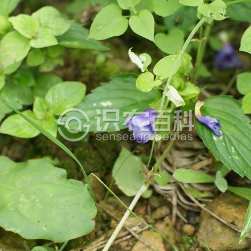 匍匐或多少直立草本,節上生根;分枝多,長而纖細。葉具長2-8毫米之柄;葉片三角狀卵形、長卵形或卵圓形,長1.5-3.2厘米,寬1-2厘米,邊緣具帶短尖的圓鋸齒;基部突然收縮,多少截形或寬楔形,無毛或疏被柔毛。花具長0.5-2厘米之梗,單朵腋生或頂生,抑或排列成傘形花序;萼具5枚寬略超過1毫米而多少下延之翅,長0.8-1.5厘米,果期長1.5-2厘米;萼齒2枚,長三角形,先端漸尖,果期開裂成5枚小尖齒;花冠長1.5-2.5厘米,其超出萼齒的部分長4-10毫米,紫紅色或藍紫色;前方一對花絲各具1枚長1-2毫米之線狀附屬物。花果期5月至次年1月。