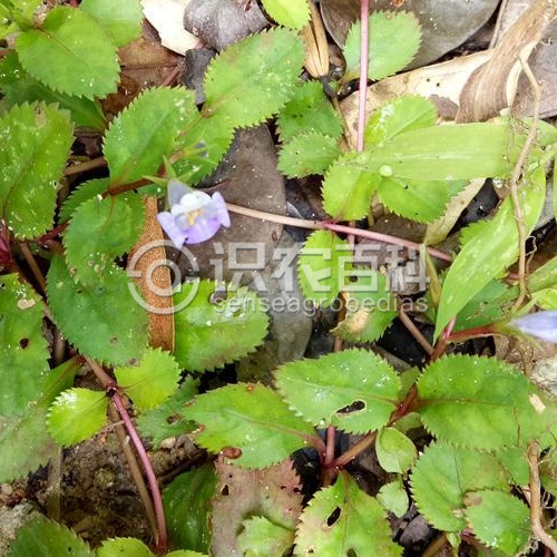 一年生草本,高10-15厘米,少主莖直立,更常分枝而長蔓,節上生根,長可達30厘米,近于無毛。葉柄長3-20毫米,前端漸寬而連于葉片,基部多少抱莖;葉片矩圓形、橢圓形、卵狀矩圓形或圓形,長1-4厘米,寬0.6-2厘米,頂端圓鈍或急尖,基部寬楔形,邊緣除基部外密生整齊而急尖的細鋸齒,但無芒刺,兩面有粗澀的短毛或近于無毛。花為頂生的總狀花序,有花2-10朵;苞片披針狀條形,花梗短,向頂端漸粗而連于萼,無毛;萼在花期長約6毫米,果期達10毫米,僅基部聯合,齒條狀披針形,無毛;花冠紫紅色,長10-14毫米,管長7-9毫米,上唇直立,2裂,下唇開展,3裂,裂片幾相等,或中間稍大;前方2枚雄蕊不育,后方2枚能育,但無附屬物;花柱有寬而扁的柱頭。蒴果圓柱形,向頂端漸尖,比宿萼長約2倍。種子橢圓形,褐色。花期6-9月,果期7-11月。
