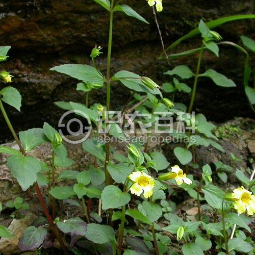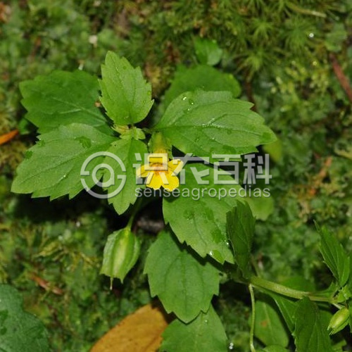 多年生草本,柔弱,常鋪散狀,無毛。莖長可達40厘米,多分枝,下部匍匐生根,四方形,角處具窄翅。葉卵形、卵狀三角形至卵狀矩圓形,長1-3厘米,寬4-15毫米,頂端急尖,基部截形,邊緣具明顯的疏鋸齒,羽狀脈,葉柄細長,與葉片等長或較短,偶被柔毛。花單生葉腋,花梗與葉柄近等長,明顯的較葉短;花萼圓筒形,長約5毫米,果期腫脹成囊泡狀,增大近一倍,沿肋偶被絨毛,或有時稍具窄翅,萼口平截,萼齒5,細小,刺狀;花冠較萼長一倍半,漏斗狀,黃色,喉部有紅色斑點;唇短,端圓形,豎直,沿喉部被密的髯毛。雄蕊同花柱無毛,內藏。蒴果橢圓形,較萼稍短;種子卵圓形,具細微的乳頭狀突起。花果期6-9月。