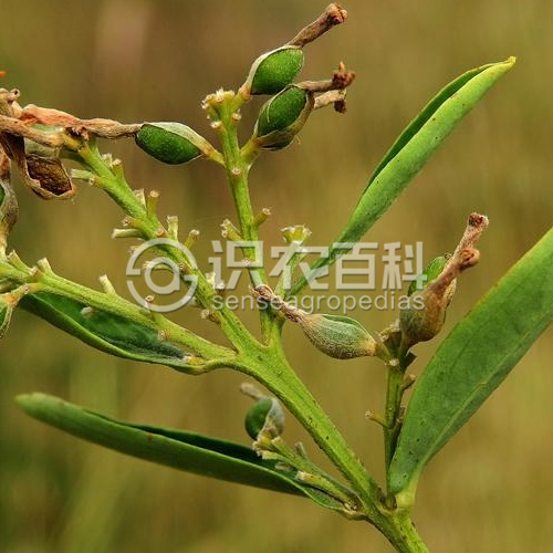 灌木,高約1米,分枝多而纖細(xì),無毛;幼枝近四棱形,綠色,后變?yōu)楹稚H~對(duì)生,無毛,近革質(zhì),披針形,長(zhǎng)2.5-5.5厘米,寬0.2-1厘米,先端尖,基部楔形,上面綠色,干后稍皺縮,下面灰綠色,光滑,側(cè)脈每邊7-8條,不明顯;葉柄極短,近于無。花黃色,花序穗狀或由穗狀花序組成的圓錐花序,頂生或腋生,密被灰色短柔毛;花梗極短,具關(guān)節(jié),花后殘留;花萼長(zhǎng)約8-10毫米,外面被灰色絹狀短柔毛,裂片4,2大2小,卵形至長(zhǎng)圓形,端圓,約等于花萼長(zhǎng)的1/3;雄蕊8,2列,著生于花萼筒的中部以上;花藥長(zhǎng)圓形,長(zhǎng)約1毫米,花絲短,近于無;子房棒狀,具柄,頂部被短柔毛,花柱短,柱頭圓珠形,頂基稍壓扁,具乳突;花盤鱗片1枚,線狀披針形,端鈍,約長(zhǎng)0.8毫米。果卵形,干燥。花期6-8月,果期9月。