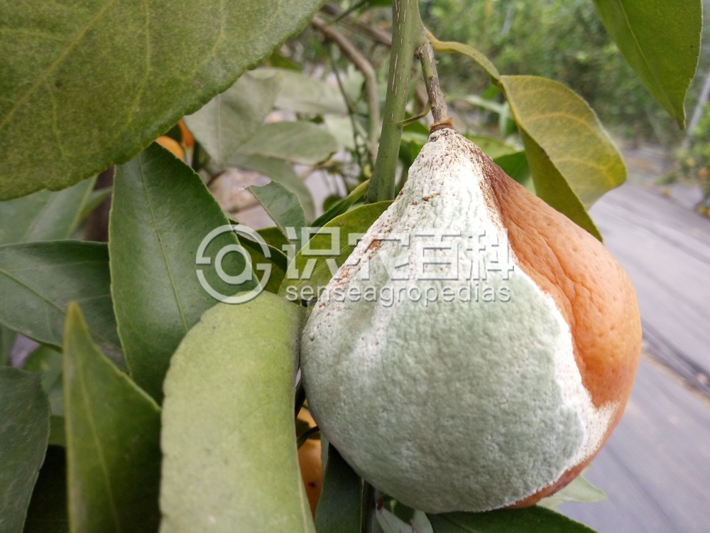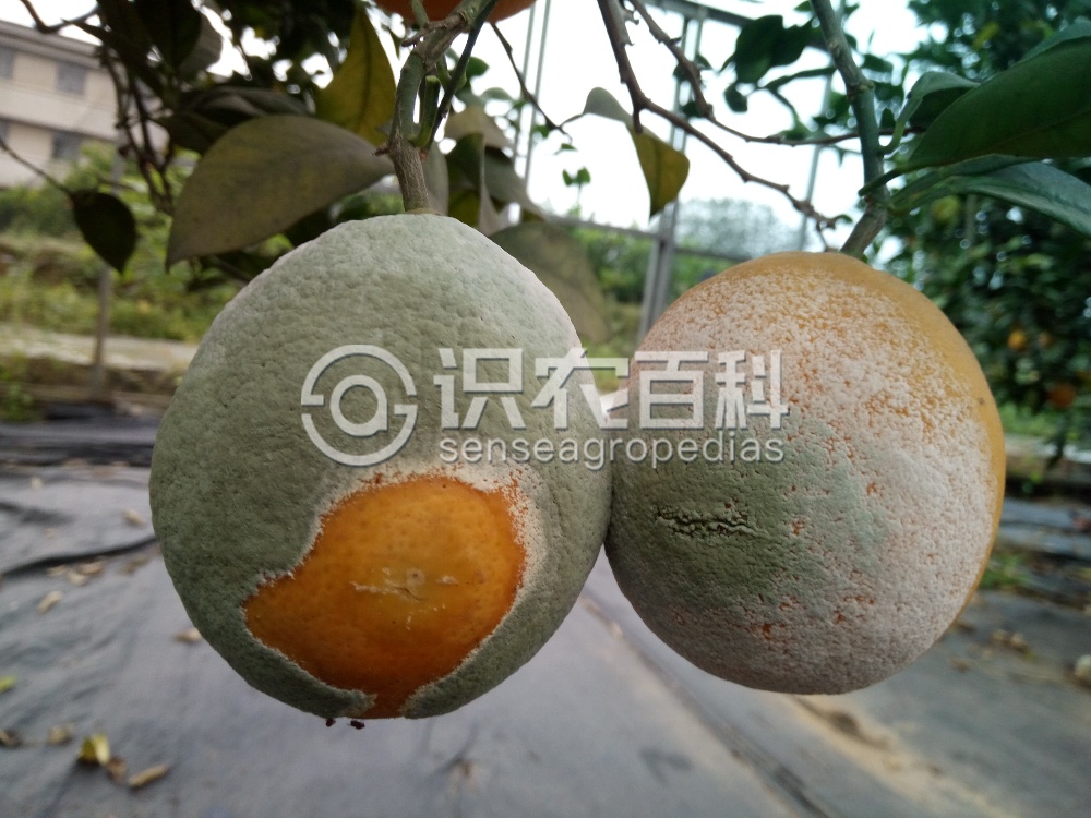 柑橘綠霉病是貯藏運輸期間發生最普遍的一種病害,易造成果實腐爛。綠霉病從采收時所造成的傷口處或果蒂部開始發生,初期果面出現水漬狀淡褐色小圓斑,病部組織軟腐,后迅速擴大,表面皺縮,病部中央逐漸長出白色霉狀物(菌絲體),霉狀物不斷增厚并向周圍擴大蔓延,中間的菌絲體漸轉灰綠色或暗灰色,略帶黏性,微有皺紋。病部邊緣水漬狀,但不規則,不明顯。病果與包裝物或包果紙接觸的部位黏得緊,不易分開。果面菌絲體厚密,細膩。病果有芳香味。