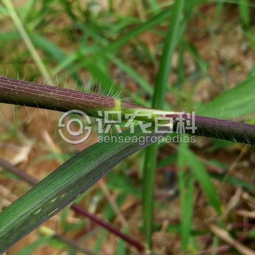 稈較粗壯,直立部分高50-100厘米,下部匍匐地面,節(jié)上生根并分枝。葉鞘常短于節(jié)間,較壓扁,具疣基柔毛,基部者密生柔毛;葉舌長(zhǎng)1-2毫米;葉片長(zhǎng)5-15厘米,寬3-6毫米,粗糙,下部?jī)擅嫔嗷崦?偁罨ㄐ虼钟玻?或3枚,長(zhǎng)5-10或達(dá)20厘米,基部多少裸露;穗軸挺直,具粗厚的白色中肋,有窄翅,寬約1毫米,節(jié)間長(zhǎng)為其小穗的2倍;孿生小穗異性;短柄(柄長(zhǎng)0.4毫米)小穗無(wú)毛,長(zhǎng)約4毫米,第一穎微小;第二穎披針形,具5脈,長(zhǎng)為小穗的1/2-2/3;第一外稃具粗壯的7-9脈,脈隆起,脈間距離極窄僅留有縫隙,頂端漸尖;長(zhǎng)柄小穗密生長(zhǎng)柔毛,長(zhǎng)約4.5毫米,與其小穗柄近等長(zhǎng);第二穎短于小穗,具3-5脈,第一外稃有5-7脈,脈間與邊緣均密生絲狀柔毛,第二外稃披針形,薄革質(zhì),灰白色,稍短于小穗,頂端漸尖;花藥長(zhǎng)1毫米。花果期6-10月。