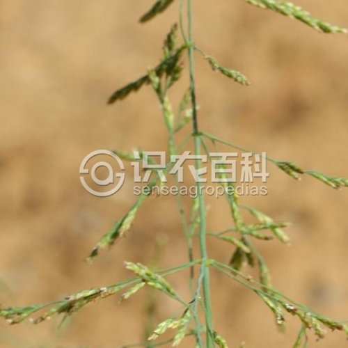 疏叢型。稈膝曲上升,高10-20厘米,徑約1毫米,具3節(jié),頂節(jié)位于下部1/4處。葉鞘無(wú)毛,灰綠色,長(zhǎng)于其節(jié)間,頂生者長(zhǎng)達(dá)10厘米;葉舌長(zhǎng)約1毫米,截平或三角形;葉片短,長(zhǎng)2-4厘米,寬1-2毫米,內(nèi)卷,上面與邊緣粗糙,質(zhì)地較硬,直伸,先端漸尖。圓錐花序廣開(kāi)展,呈金字塔形,長(zhǎng)5-8厘米,寬達(dá)5厘米;分枝每節(jié)2枚,長(zhǎng)2-4厘米,下部裸露而平滑;側(cè)生小穗柄長(zhǎng)約0.5毫米,微粗糙;小穗長(zhǎng)約2.5毫米,含2-3花,淡黃色,后帶紫色;穎先端尖,與其邊緣具緣毛細(xì)齒,第一穎長(zhǎng)0.6-1毫米,第二穎長(zhǎng)1.2毫米,具3脈;外稃長(zhǎng)圓形,先端截平,具緣毛細(xì)齒裂,5脈不明顯,長(zhǎng)約1.5毫米,基盤(pán)有短毛;內(nèi)稃兩脊上部平滑,先端具毛狀細(xì)齒;花藥長(zhǎng)0.5毫米。花果期6-8月。