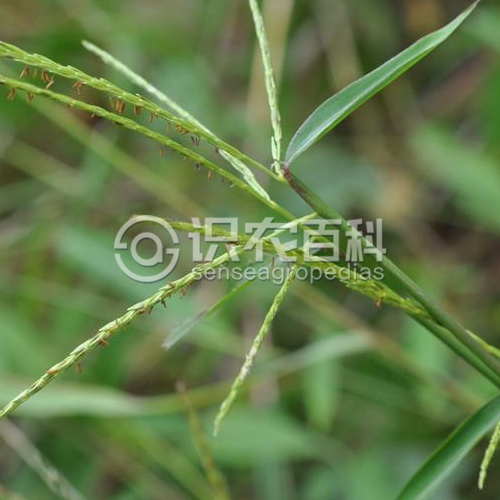 稈下部甸甸地面,節上生根,高達1米,多分枝,無毛。葉鞘短于其節間,鞘口具柔毛;葉舌截形,長約0.5毫米,背面生毛;葉片長4一8厘米,寬5一8毫米,邊緣祖糙,頂端漸尖,基部狹窄,中脈白色。總狀花序2一6枚,長約5厘米,近指狀排列于長5一6毫米的主軸上,總狀花序軸節間稍短于其小穗,較粗而壓扁,生微毛,邊緣疏生纖毛;無柄小穗長4一4.5毫米,基盤具短毛或無毛;第一穎披針形,紙質,背部有凹溝,貼生微毛,先端具網狀橫脈,沿脊有鋸齒狀粗糙,內折邊緣具絲狀毛,頂端尖或有時具二齒;第二穎沿中脈粗糙,頂端漸尖,無芒;雄蕊3枚,花藥長約1毫米或較長。穎果長圓形,長約2.5毫米有柄小穗相似于無柄小穗或稍短,小穗柄短于穗軸節間?;ü?-11月。