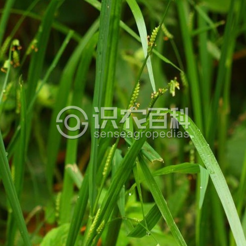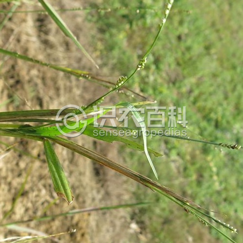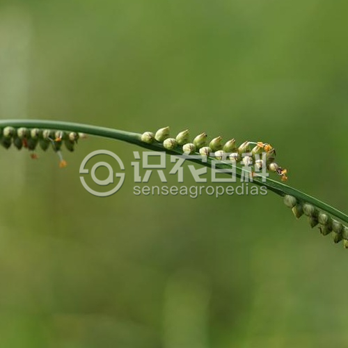 多年生草本。稈少數(shù)叢生或單生,壓扁,高30-100厘米。葉鞘光滑,兩側(cè)壓扁而具脊;葉舌短小,長約0.5毫米;葉片線狀披針形,長5-30厘米,寬5-10毫米,先端急尖,基部略呈心形。穗狀花序6-9枚,長1.5-2.5厘米,稀疏排列于長達40厘米的主軸上,短于主軸的節(jié)間;穗軸延伸為一小尖頭;小穗卵形,長1.5-2.5毫米,左右排列在穗軸的一側(cè),背部隆起,乳白色或稍帶紫色;含2小花,僅第2小花結(jié)實;第一穎廣卵形,先端圓形,長約為小穗之半,具3脈;第二穎略短于小穗,具7脈;第1外稃與小穗等長,具5脈;第2外稃骨質(zhì),具細點狀;內(nèi)稃透明膜質(zhì),略短于外稃。穎果骨質(zhì),橢圓形,腹面平,背面隆起。 花果期7-10月。