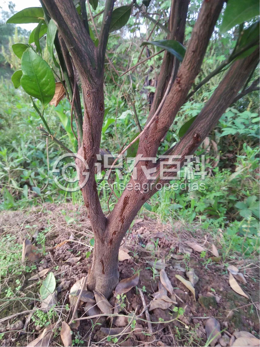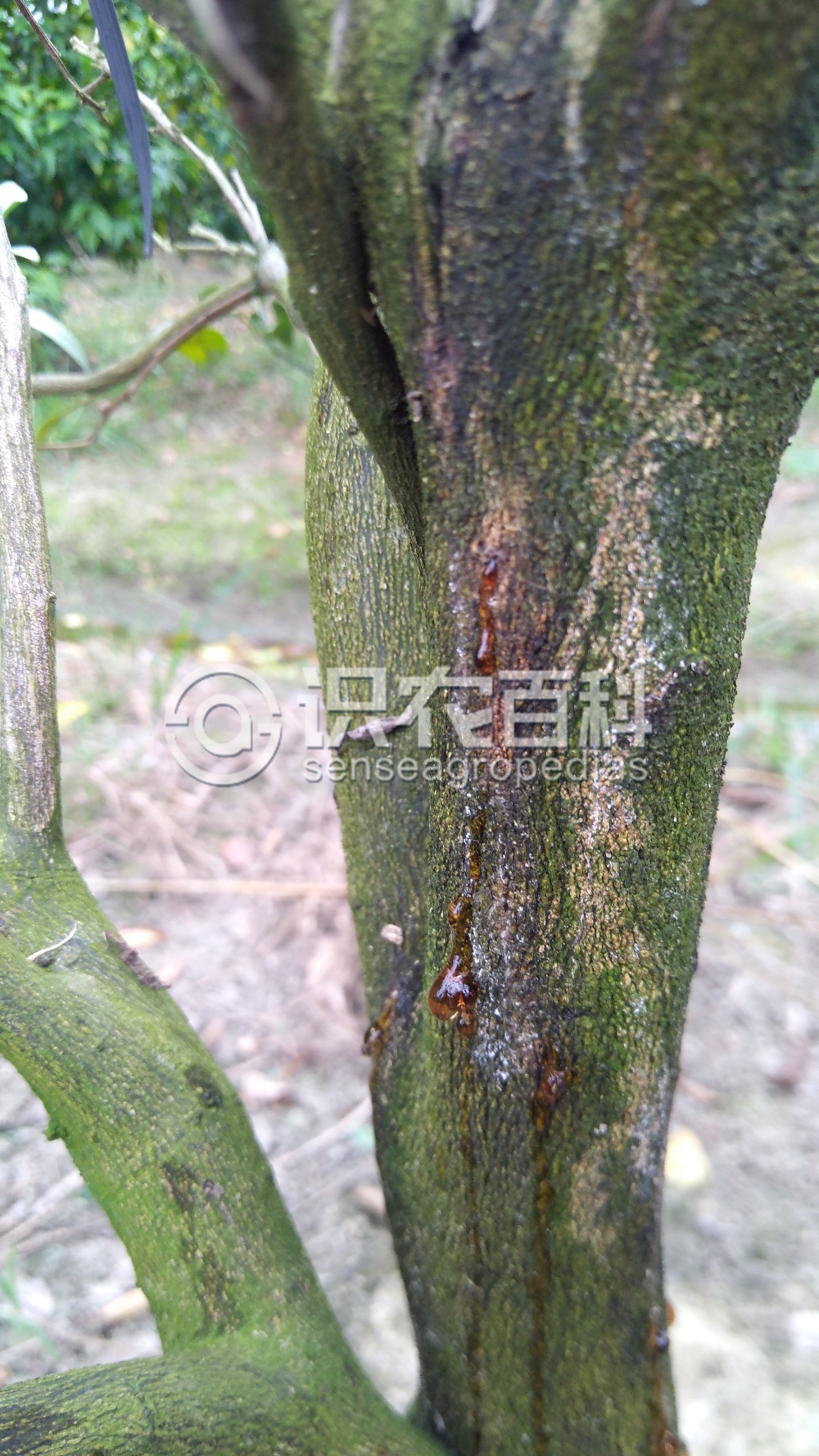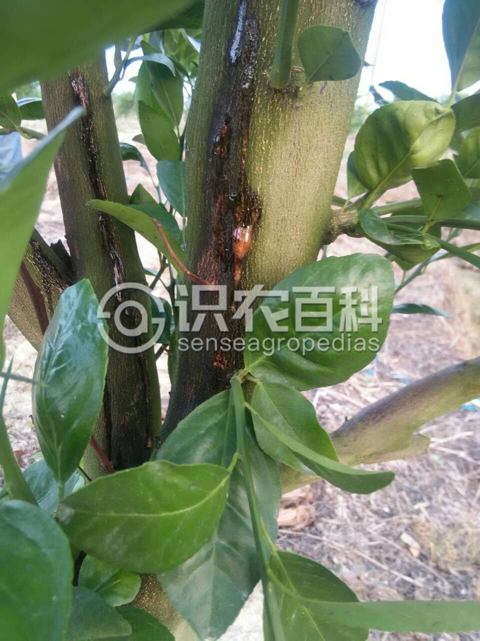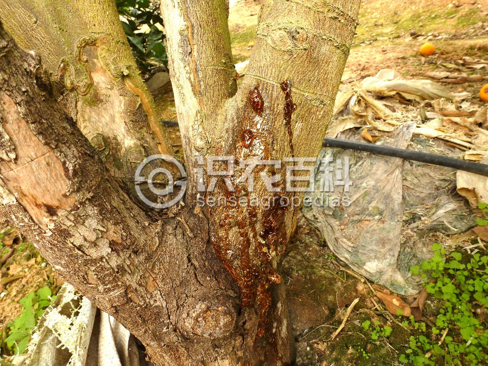 初發病時,皮層出現紅褐色小點,疏松變軟,中央開裂,流出露珠狀的膠液;以后病斑擴大,不定形,病部皮層變褐色,有酒糟味,流膠增多,病斑沿皮層縱橫擴展。病皮下產生白色層,病皮干枯卷翹脫落或下陷,剝去外皮層可見白色菌絲層中有許多黑褐色、釘頭狀突起小點。病樹葉片淡黃色、失去光澤、早落,枝條枯死,樹勢弱,開花多,結果少,產量低,果質劣;嚴重時,主干皮層全部受害,導致植株死亡。苗木發病,多在嫁接口、根頸部表現癥狀,病斑周圍流膠,樹皮和木質部易腐爛,導致苗木枯死。與樹脂病引起的流膠型癥狀主要區別是:柑橘流膠病不深入樹干木質部為害。